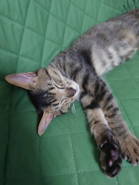 | 特徴(性格など) | キジ子猫です。 元気で甘えん坊です。一人遊びも得意です。 膝に乗って指を舐めたり甘噛したりします。 |