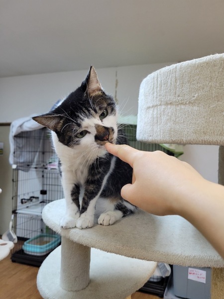 | 特徴(性格など) | 2020.8.25生まれ(推定) 毛色:キジ白 お鼻の模様はニンニクのようで、おててまわりにはごま塩のような点々模様がかわいい男の子。 抱っこされるのも撫でられるのも、お尻ポンポンも大好きです。 甘えん坊さんしたい時には静かに側に寄ってきてピッタリとくっついてきてすごく可愛らしいです。 おもちゃで遊ぶのも好きで、じゃらしで遊ぶと高いジャンプを見せてくれます。 とても穏やかなので、一緒に暮らしている成猫や子猫ともいい距離感で過ごしています。 |