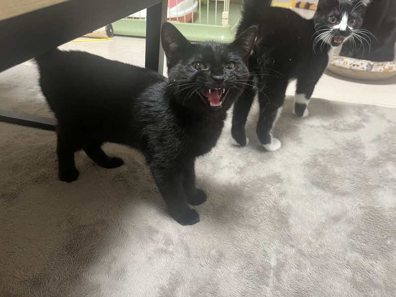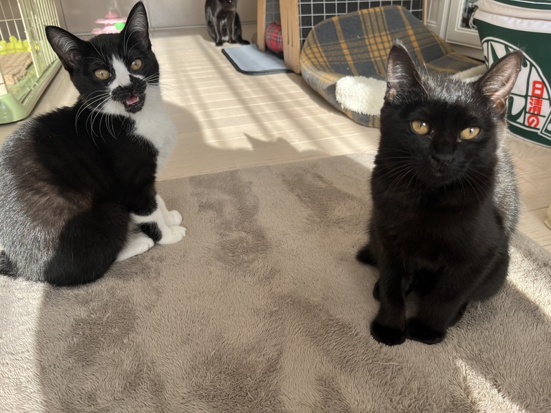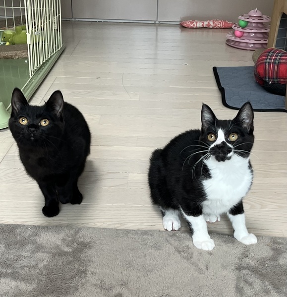 | 特徴(性格など) | 白黒→男の子。やんちゃで遊び好き。甘えん坊。他の猫や人のそばにいます。ご飯が食べたくなったら鳴いて寄ってきます。 黒→女の子。遊び好き。猫も人も大丈夫。1人でいることも平気。賢い。 |