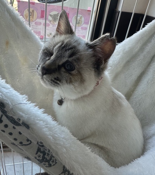 | 特徴(性格など) | シャム柄の女の子 人によくなれています。 右目は眼球欠損 左目は角膜白濁、結膜癒着 猫風邪の後遺症だと思われますが現在経過観察中で特別なケアはしていません。 |