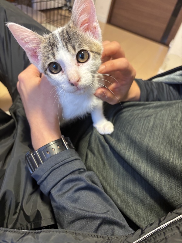 | 特徴(性格など) | 病院に連れて行って ノミダニ駆除済 お腹の虫駆除済 白サバ 個性的な模様 耳が大きい ひとり遊び得意 すぐゴロゴロする ほとんど噛まない |