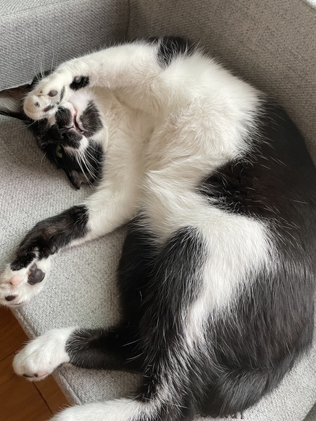 | 特徴(性格など) | おしゃべり大好きな甘えん坊の女の子。 すぐにお腹を見せてゴロゴロ言います。 顎に特徴的な模様あり(写真参照)。 体重3.5kg、短めのカギしっぽ。 |
