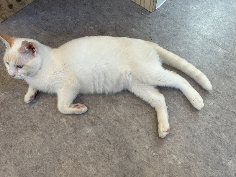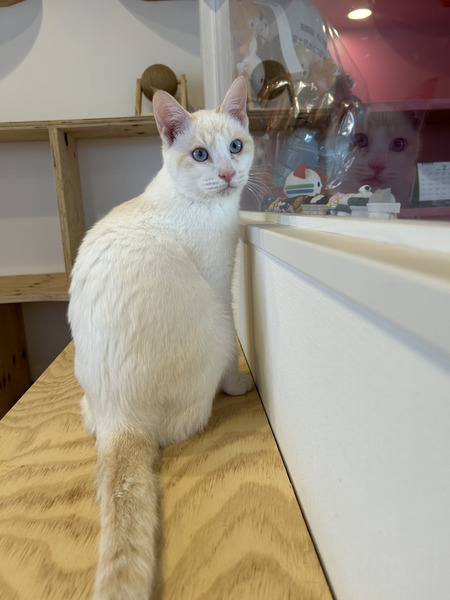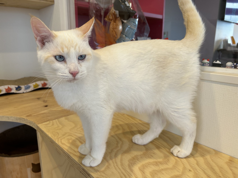 | 特徴(性格など) | おっとりしていて人懐っこい男の子です! おもちゃ遊びも他の猫と遊ぶのも大好き。 お掃除中も構ってほしくてすり寄ってきます。 コロコロローラーでお顔をマッサージされるのも好きな美容男子です。 白猫ですが、しっぽは薄く縞模様があります。 |