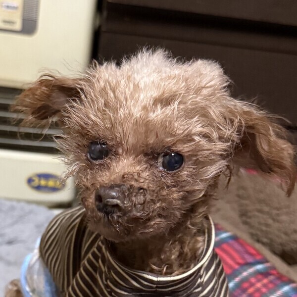 | 特徴(性格など) | *名前* tono(との)君 *犬種* トイプードル(タイニープードル) *性格* ビビりだけど甘えたな男の子です♪ 人の事は大好きで、保護した当日から甘えに来てくれました。 他の子と遊んでいると「僕とも遊ぼ♪」と寄って来ます。 ただ何かをして遊ぶというより、抱っこしてもらうのが好きな子です。 寝る時もいつの間にか横に来て眠っています。 預かり宅のワンコ達とは問題なく接していますが、自分が寛いでる時に他の子に邪魔されるのは嫌いなようです。 ただ自分が邪魔するのは問題ないようで、他の子が眠るベッドに勝手に入って寝たりしています。 良いように言うと凄くマイペースな子です(^^;) とてもビビりな性格なので、フローリングが苦手です。 マットを敷いてあるところは気にせず動いてますが、フローリングの床は歩くのが怖いようです。 予期せぬ物音にも凄くビックリして飛び上がります。 神経質な面がある子です。 今まで散歩の経験が無かった子なので現在お散歩の練習中ですが、見慣れぬ場所を怖がるので散歩は抱っこでしています。 車やバイクなどの大きな音も怖いようです。 環境が変わると間違いなく怖がると思いますので、今後も気長に散歩の練習に付き合って下さる方を希望します。 排泄は室内のみでしています。 基本はトイレでしてくれるのですが、マーキング癖がまだあるので目を離す時はマナーウェアを着用しています。 保護当初は普通にマーキングをしてたので、最初はマナーウェアを併用される方が良いと思います。 現在、お留守番と就寝はフリーでしています。 環境に慣れトイレをキチンと覚えれば、新しいおウチでも常時フリーで大丈夫と思います。 就寝時は必ず同室で一緒に過ごしていただける事を希望します。 *申し訳ありませんが、単身者・未婚カップル・65歳以上の方(後継人がおられても不可)、また長時間のお留守番があるご家庭からのご応募はお受け出来ません。 同居のご家族様がご在宅で日常的なお留守番がない場合でも、在宅者が65歳以上の方やお子様の場合お断りさせて頂きます。 (SDRNから譲渡実績がある場合は除く) また体が凄く小さな子なので、お子様がいらっしゃる場合は中学生以上のご家庭でお願いします。 *健康状態* フィラリア(-)・混合ワクチン接種済み。 血液検査・検便実施済み。 去勢手術・スケーリング・抜歯実施済み。 フロントライン・ドロンタール投与済み。 マイクロチップ装着済み。 現在の体重は1・2kgで凄く痩せています。 タイニーサイズの子なので適正体重は2kg前後だと思います。 保護当初から口内環境が悪く、スケーリングで21本の抜歯になりました。 元から欠損した歯があったので現在は下の犬歯1本のみになりましたが、ふやかさずドライフードをそのまま食べています。 重度の歯周病のため左下顎の骨が溶けて折れてしまってました。 ただ骨が脆くなっているのと小さい彼の口に合うプレートなく経過観察となっています。 悪い歯はすべて処置していただいたので様子見で大丈夫でしょうとの事でした。 確かに手術前はお口が痛くて食べムラが酷かったのですが、痛みがなくなり以前よりすんなり食べてくれるようになりました。 ただ人がそばに居ないと食べないので、食事中はそばに付き添っています。 涙の量が多かったので、初期メディカルで目の検査をしていただきましたら右目がドライアイでした。 現在は毎日点眼をしています。 |