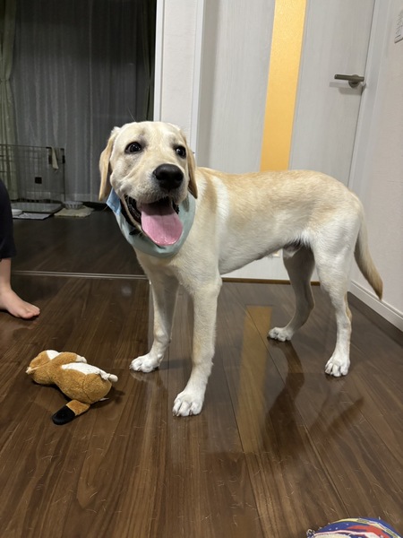 | 特徴(性格など) | イエローのラブラドールです。オーガニックフードと、お米、お肉、お野菜をあげていたので、毛並みが綺麗です。 性格は温厚で人懐っこく甘えん坊です。育ち盛りで食欲旺盛です。 滅多に吠えることはありませんが、大好きなお友達を見つけると、遊んで遊んでとアピールします。近所の人たちからも、とっても人懐っこくて可愛いねぇ、と可愛がってもらっていました。 「ハウス」「お手」「おかわり」「待て」ができます。 |