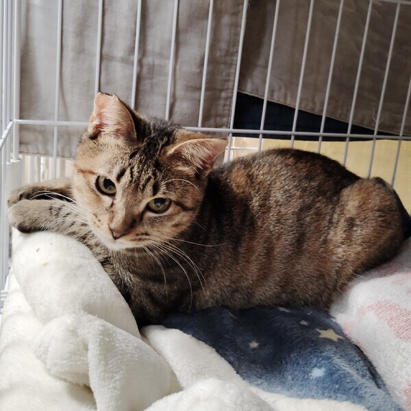 | 特徴(性格など) | 庭で飼育されていたところを保護しました。 丸顔、丸い目のキジトラ女の子です。 しっぽは短くて曲がっています。 小さいころから人と触れていたので人見知りはなく 家のなかの生活にもすぐに馴染めました。 小柄でピョンピョンと飛ぶように走る姿がカワイイです。 |