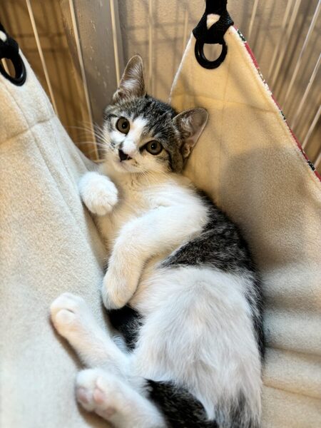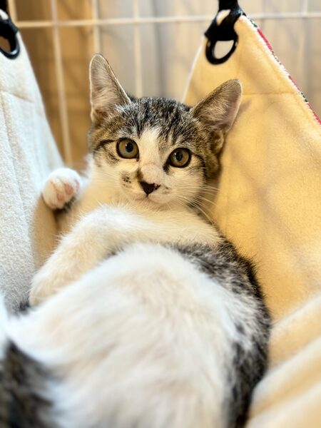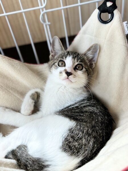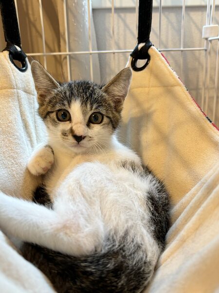 | 特徴(性格など) | 今回は4兄弟で生まれ2匹は別団体さんが里親探しをすることになりました。 ちょっと控えめで、お兄ちゃんの跡をついてくる無敵の弟キャラ。 守ってあげたくなるようなちょっと弱々しい雰囲気が 保護欲を掻き立てます。 保護された直後は不安でオドオドしてましたが、今ではのびのび遊びゴロゴロハンモックを使いこなして寝ております。 食欲もあって健康そのもの! やんちゃな男子ではありますが兄弟で引き取った場合、 2匹でプロレス遊びをしていてくれるので無限体力の子猫に永久につきあわされることがないというメリットもあります。 1匹でも、兄弟でも◎ |