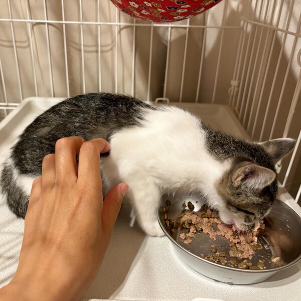 | 里親募集する理由 | 千葉県の多頭飼育現場から保護しました。 濃いめに入ったアイラインと口横のエクボが愛くるしい男の子。 その多頭飼育現場は倉庫のような場所で、なんとなく餌をやっている人はいて、 近所の猫ボラさんもその場所の状況には気づいてTNRを進めている中で 餌場に現れる子猫・・・ 実はドラクロアドッグランチとしては今回で2回目の子猫保護。 今ならまだ人馴れが間に合う、 今ならまだ室内での生活をさせてあげるチャンスが有る。 そう判断をして捕獲に踏み切りました。 |