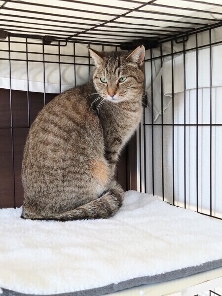 | 特徴(性格など) | 【毛色】キジトラ ・ところどころ茶色が混ざっていて綺麗な毛色です。 【性別】♀ 【年齢】推定 1歳半くらい 【しっぽ】まっすぐしっぽ 【目の色】グリーン 【体重】3.4㌔ エイズ白血病陰性 ✿耳に桜カットあり✿ ❀可愛いお顔立ちをしています。 ❀手からチュールを食べたり、頭を撫でることができます。 ❀臆病な性格で唸ることがあります。 ❀気長に優しく接していただけますと嬉しいです。 |