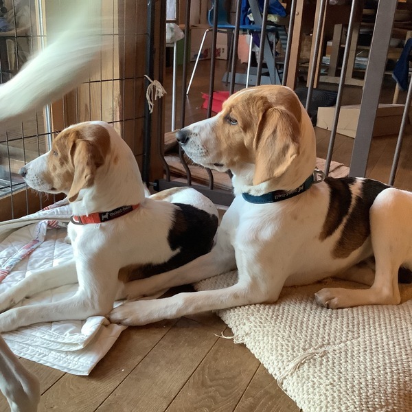 | 特徴(性格など) | 親は猟犬で見た目はアメリカンフォックスハウンドに似ています。 体格は現在10.5キロ、あと2〜3キロ大きくなりそうです。 性格は人に甘えたい元気で優しい子。 種類としては運動能力も高く活発ではあるため毎日の運動量やトレーニングが必要です。 賢いのでしっかりと主従関係を築けば犬も飼い主も快適に暮らせると思いますが、自由にすると散歩も掃除機状態になる犬種だと思います。 まだトレーニング始めた少しですが、この子は人の存在を感じながら歩くことに慣れてきています。 吠えると猟犬特有の通る声です。 散歩など、鳥や人、犬に吠えてしまいますがだんだんと慣れて減ってきています。 (攻撃性は無く、遊びたいという好奇心からです)この子は怖がりで自分を守るためにも声がでているので経験や慣れが必要です。 完全に吠えが無くなるかは分かりませんのでその辺りを受け入れていただきたいです。 人が大好きで、さわってもらいたい、寝る時は必ずくっついて寝たい子です。 兄弟と走り回って遊んでいても人のところまで来てさわられに来ます。怖がりですぐブルブルと後ろ足が震えてしまうので安心できるよう暖かく接していただきたいです。 |