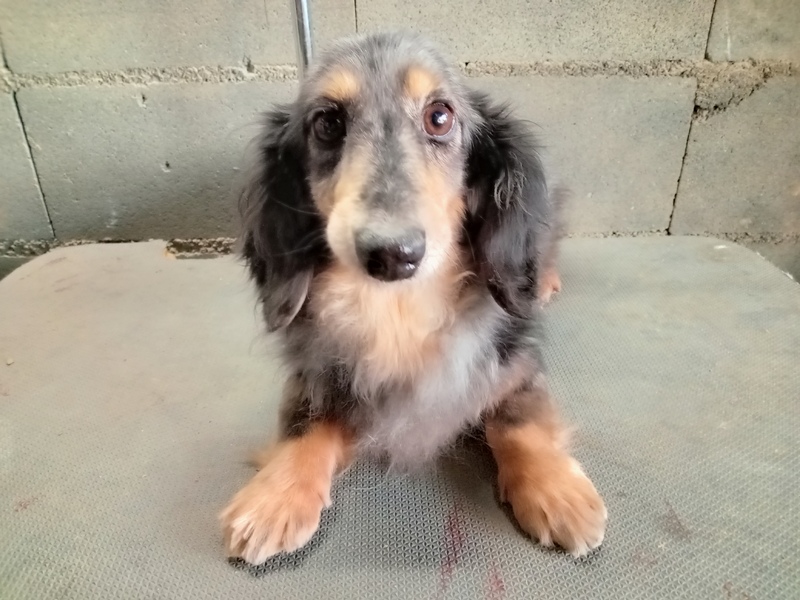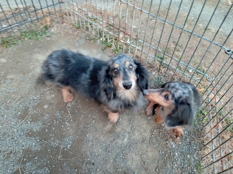 | 特徴(性格など) | 美しいシルバーダップルの男の子です。 カニンヘン登録らしいのですが、ミニチュアに近いと思います。 ダックスフンドらしい人懐こい子です。 ロングヘアーですが、あまり伸びないタイプです。 室内トイレや散歩は練習が必要です。 留守番中や就寝中はケージ内で大人しくしています。 他の子とも仲良く出来ます。 快食快便、毎日元気に走り回っています。 何本か抜歯しましたが、早い内にスケーリングを行うと良いと思います。 保護犬ですので、過度に健康問題を気にされる方はご遠慮ください。 |