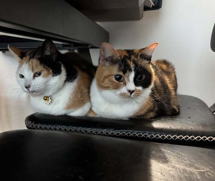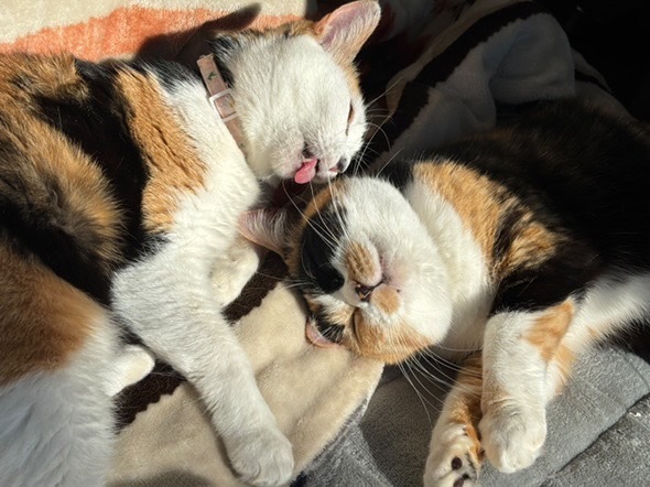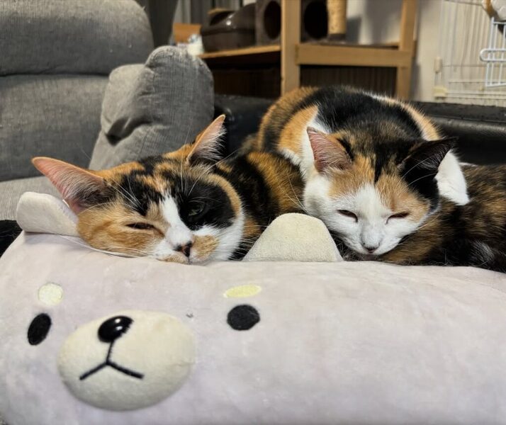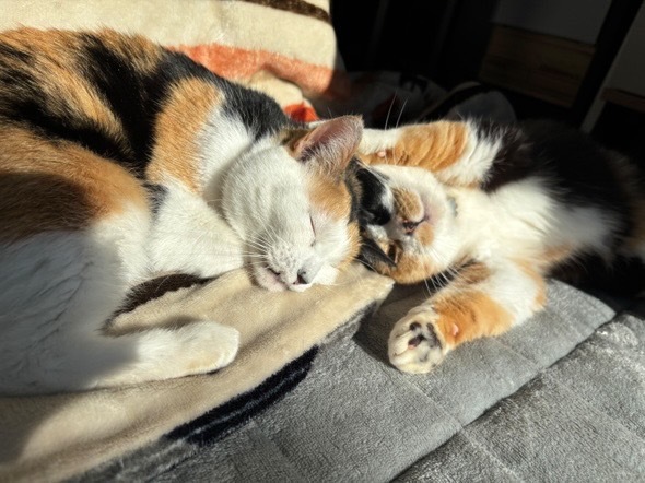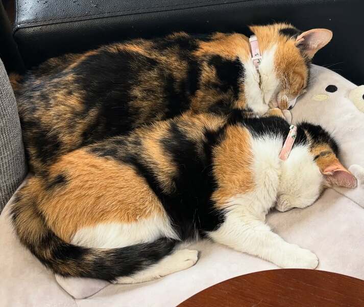 | 里親募集する理由 | 群馬県内某住宅街にある保護主宅。痩せた小さな三毛猫が、保護主の庭に来たのが始まりでした。 先に保護したのは千代姫。警戒心は強めでしたが、よほど飢えているのかフードをあげるとよく食べました。 次第に信頼してくれたのか、少しずつ触れるようになり、犬用のキャリーケースにおやつを置き、入ったところを保護。 初日は少し怯えた様子でしたが、翌日には「撫でて」と頭突きをかますようになりました。 千代姫を保護した約二ヶ月後、よく似た柄の三毛猫がまたも保護主の庭に現れました。 兄弟ではないか?千代姫を保護したのに兄弟を無視するのか?と、またも保護を決めました。それが菊姫です。 獣医師の見立てによると、歯周病が進んでいるためおそらく当時で4〜5歳。年齢的にも千代姫の兄弟ではなく親子だろうと推測されました。 また避妊手術を受ける際、菊姫はお腹に3匹赤ちゃんがいたため堕胎しました。 どちらも保護当時は互いを警戒していましたが、やはり血のつながりがあるのか、今では挨拶がわりにスリスリし、寒いとどちらからともなく寄り添って眠るくらいには仲良し。 千代姫の保護当時、彼女は家族の一員として迎え入れましたが、その後保護した菊姫の里親さんを探している間に、2匹があまりにも仲が良くなって引き離すのが忍びないため、この度2匹同時での譲渡を決めました。 |