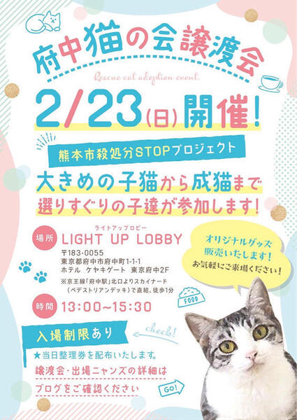 | その他(譲渡条件など) | ୨୧⌒⌒⌒⌒⌒⌒⌒⌒⌒⌒⌒⌒⌒⌒⌒୨୧ 府中駅直結⭐︎譲渡会のお知らせ ୨୧⌒⌒⌒⌒⌒⌒⌒⌒⌒⌒⌒⌒⌒⌒⌒୨୧ 【 日時 】2月23日(日)13時〜15時半まで 【 場所 】LIGHT UP LOBBY (ホテル ケヤキゲート 東京府中2F) ※混雑時は整理券を配布。ご予約は必要ありません。 https://chuneko.exblog.jp/32603337/(会場へのご案内) ※会場への直接のお問い合わせはお控えください。 ご質問はfuchu_nekonokai@yahoo.co.jpまで こんにちは。『NPO法人府中猫の会』です。 地元のTNR活動&保護活動(野良猫を増やさない取り組みや行き場のない猫達の保護)に尽力しているボランティア団体です。 その他にも、当ボランティアの取り組み『熊本市殺処分STOPプロジェクト』として、197匹の保護猫達を熊本から東京に空輸して参りました。 今回ご披露する猫ちゃん達は、くまっ子空輸にゃんずの他、飼い主から飼育放棄されてしまった捨て猫、強制執行で夜逃げした飼い主から放棄された猫など、みんな行き場のない子達ばかりを保護し、育て上げて参加させています。 お留守番OKなのでお仕事をフルタイムでお持ちのご家庭でも問題なく迎えていただけます。 自信を持って、この度もかわいい子ども達をご紹介させていただきます! 血液検査、ワクチン2回接種、マイクロチップ装着、全ての医療を終えております。ご安心ください。 活動内容や保護猫達の様子が気になる方は、ぜひ!YouTubeちゅー猫チャンネルをご視聴ください。 ↓↓↓ ฅ^•ﻌ•^ฅ♡ちゅー猫チャンネル https://youtube.com/@chuneko 【 よくあるご質問 】 ◆猫を飼いたい。でも保護猫ってハードルが高い気がする… その点はご安心ください。出場する全ての猫達はみんな家猫訓練を受けており、トイレ訓練もパーフェクトな猫達です。 猫飼い初心者OKな猫ちゃんも多数出場します。 ◆60歳を超えているが、猫を迎えたい。 今時の60代様、70代様は、大変お若くアグレッシブでいらっしゃいます! そんな方々にはぜひ成猫さんをオススメさせていただきます。 今回出場する成猫さんは、捨てられた子達ばかりです。(多頭崩壊、飼育放棄、夜逃げによる強制執行) みんな心に傷を負っている子達を保護しております。しばらく心のケアや家猫訓練をバスした子達を出場させますので、ぜひ!会いに来てください。 ※60歳以上の方は後継人をお願いしております。後継人の方とご来場いただくと私達も選考しやすいのでよろしくお願いします。 ◆わが子の為にも保護猫を迎えたい!しかし、私達家族一同、猫を飼うのは初めてです。どうしたらいいですか? そのようなご家庭こそぜひ!お待ちしております! 猫ちゃんの魅力を知っていただきたいのと、お子様が保護猫達と一緒に育つ事により『命に優しい情操教育』となると願っている当会です。 喜んでお待ちしております。 ※猫アレルギー問題があります。初めて猫を飼う方は猫アレルギー検査を事前にしていただくと私達も選考しやすいです。 特にお子様には必ず検査をお願いします。 ◆仕事があって、お留守番をさせるのが心配… ご心配はご無用です! 今回出場する子達はみんな成猫さんなので、一日フルタイムでお仕事をお持ちのご家庭でも問題なく迎えていただける子達ばかりです。 【 譲渡会にご参加くださる方々へ 】 ₍ᐞ•༝•ᐞ₎◞ ̑̑ ◎混雑を防ぐ為、入場制限をさせていただきますが、ご予約の必要はございません。 入り口カウンターにてスタッフが整理券を配布いたしますのでご協力お願い申し上げます。 ₍ᐞ•༝•ᐞ₎◞ ̑̑ ◎初めて猫ちゃんを迎える方(特にお子様のいるご家庭)は、猫アレルギーの有無を明確にしてくださると選考しやすいです。 ₍ᐞ•༝•ᐞ₎◞ ̑̑ ◎譲渡会はお見合いのみの場となっております。 ご来場前に必ず下記の事項をご参照ください。 ▶︎譲渡会のシステムについて◀︎ https://chuneko.exblog.jp/32604872/ 【見学希望やご支援者の方々へ】 ₍ᐞ•༝•ᐞ₎◞ ̑̑ いつもありがとうございます♡ 会場はホテルのカフェとなっております。 お飲み物をご注文くださればお席にご案内いたします。(入口スタッフに一言お申し出ください。) 大変申し訳ないのですが、里親希望の方々を優先的にご案内させていただくのをご了承の上、お越し下されば幸いです。 会場では、ちゅー猫オリジナルグッズも販売しております。 普段、ネットで販売している公式グッズの現物をお手に取ってご覧いただけます。 |