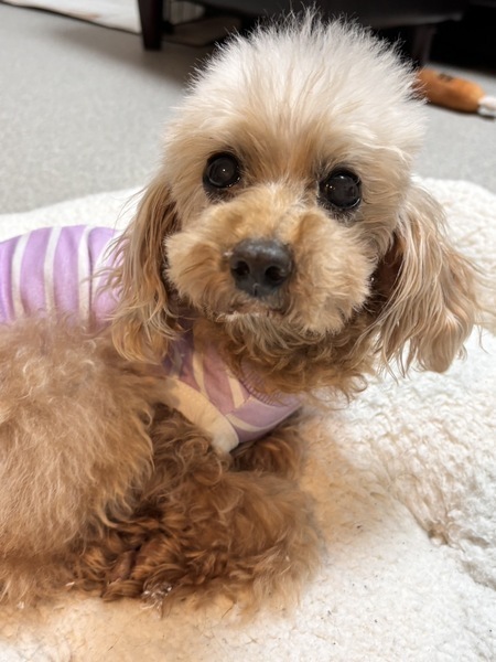 | 特徴(性格など) | 名前(仮) ぷうこ 性別 メス 犬種 トイプードル 毛色 アプリコット 年齢 推定8~9才 体重 2.7キロ 性格 大人しく甘えん坊 トイレ: シート認識30%食糞します。 散歩: たまに止まりますが、上手に歩けています。他のワンちゃんや飼い主さんとも上手に挨拶できます。 日常の様子 寝ている時間が多いです 犬にも人にも寄ってきますが遊ぶわけではないです ケージでのお留守番は最初吠えますが、しばらくすると諦めます。マウンティングします お手入れ 毎月のトリミング・毎日のブラッシング・歯磨き・耳掃除・涙やけケアなど ※トリミング犬種なので、必ず毎月1回サロンでトリミングをして可愛く清潔にして頂ける方、それだけの経済的余裕がある方を希望します フード ミシュワンにウェットフードトッピング 健康状態 フィラリア 陰性(-) ワクチン 5種混合接種済み マイクロチップ 装着済み 避妊・去勢 避妊手術済み その他 触診・聴診・血液検査・検便、異常なし 駆虫薬投与・ノミダニ駆除済み・スケーリング済み 特記★乳腺腫瘍の摘出手術をしており、グレード2の乳管癌でしたがリンパへの転移はありませんでした。 頭に小さな嚢胞あり。両目白内障、耳も遠いです。 足が滑りやすいためお散歩で筋力を付ける必要があります。 |