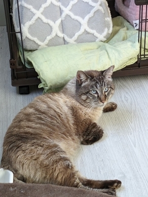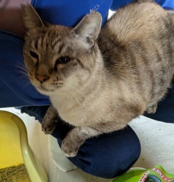 | 特徴(性格など) | シャムmix、年齢は不詳です。 オケリ君は、元飼い主さんが命名されていました。 茶色系のシャムmixです。 おとなしい性格なので、抱っこ中に爪切りも出来ます。 猫はあまり好きではないようで、出来るなら1匹飼いでお願いしたいです。 |