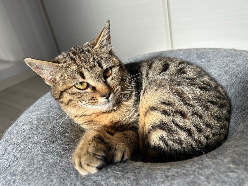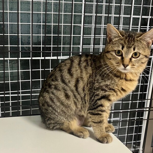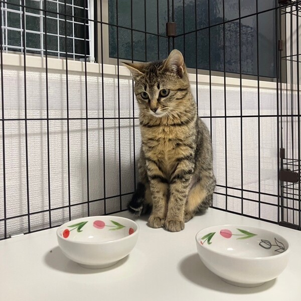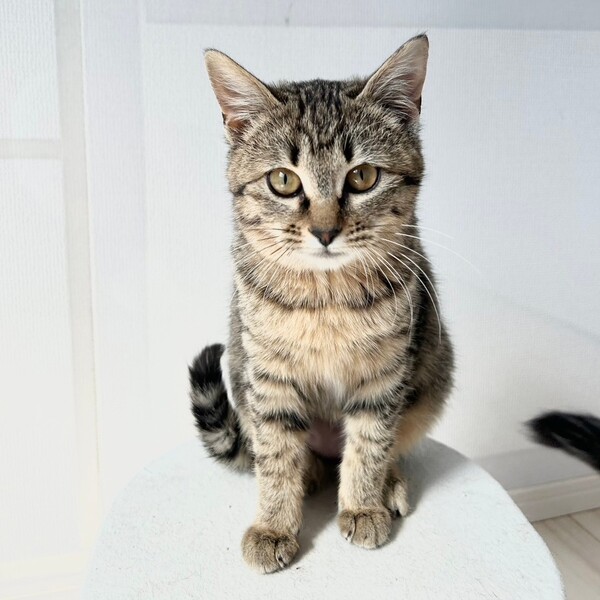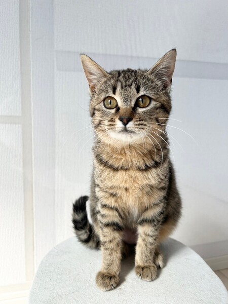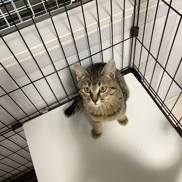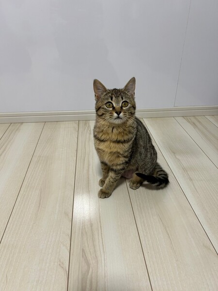 | 特徴(性格など) | 2024.11.12生まれ(推定) 毛色:キジトラ くっきりキジ柄が可愛い女の子。 むっちりとした身体、短めの手足、丸顔がチャームポイント。 慎重派ですが性格はおとなしく、なでなでや抱っこできます。 爪切りもおとなしくやらせてくれるお利口さん。 ご飯が大好き。 |