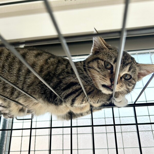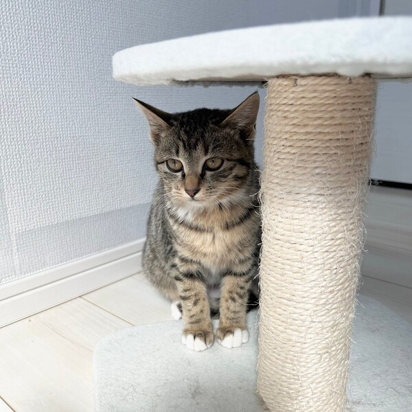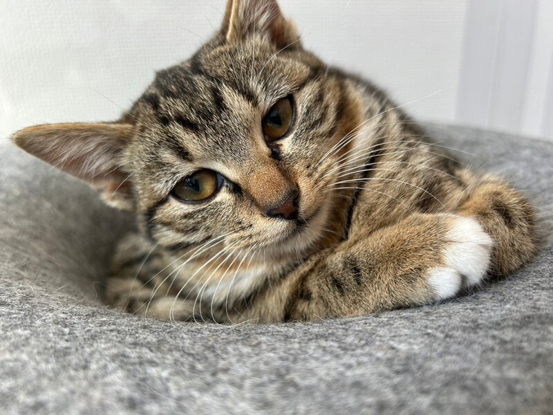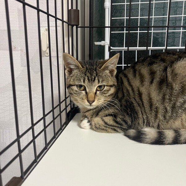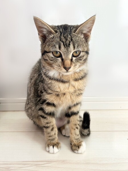 | 特徴(性格など) | 2024.11.12生まれ(推定) 毛色:キジトラ キジ柄で、手足が短く手先だけ白いのがチャームポイントの可愛い女の子。 おとなしく、慎重派な性格で少しビビリなところも。 人馴れはゆっくりですが、なでなでで喉をぐるぐる鳴らしてリラックスしてくれるのが可愛いです。 遊ぶのが大好きでおもちゃに飛びつきます。 他の猫ちゃんとは比較的早くに仲良くなれる子。 |