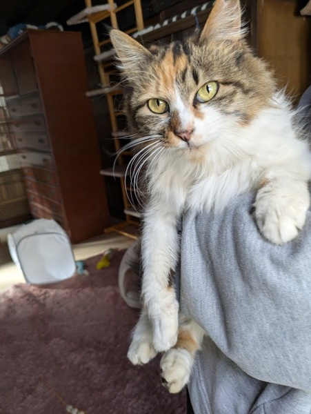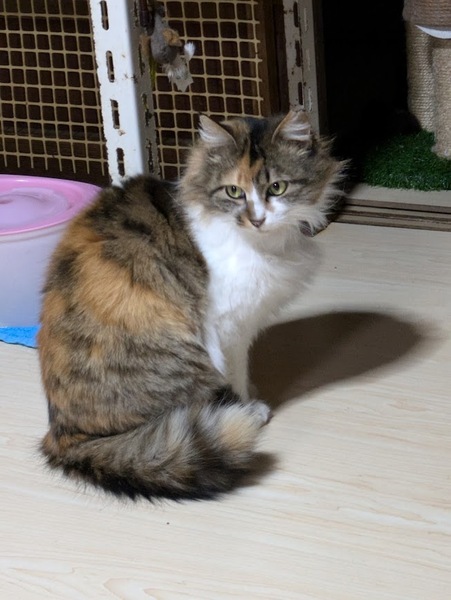 | 特徴(性格など) | 長毛の三毛猫。 とてもおとなしく、人馴れしていて、抱っこも大好きです。 他の猫とも上手に共存出来ます。 |