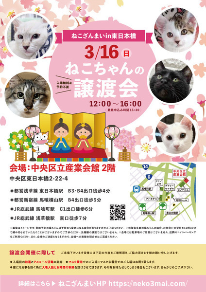 | その他(譲渡条件など) | 11:30より、2階会場入口にて受付を開始します。 受付時に入場予定時間が記入された整理券をお配り致しますので、整理券を受け取った方はお時間になりましたら2階会場入口に番号順にお並び下さい。 ※11:30より早くいらしてもお待ちいただく場所がございません。 また、近隣にお住まいの方や他階フロアのご利用者様にご迷惑となる場合がございますので、受付開始時間にあわせてお越しくださいますよう、何卒ご協力お願いいたします。 ※ねこざんまい譲渡会は、先着順で里親様を決定する譲渡会ではありません。 先に申し込みをした方を優先することもありません。 お話をして、その猫ちゃんに合ったおうちに決めさせていただいております。 12時に開場し、里親様の決定は14時以降となります。 14時以降にご入場の場合、希望の猫ちゃんが決定している可能性があります。 また1頭に対し多数のご希望をいただいた場合、早めに申し込みを締め切らせていただく場合がございますので、予めご了承下さい。 里親様決定は14時以降となります。 その後、迎え入れ準備の説明等のお時間も頂戴しますので、お時間に余裕を持ってご来場下さい。 ~~~~~~~~~~~~~~~~~~~~~~~~~~~~~~ ★仔猫ご希望の里親様★ 仔猫ちゃんたちは、まだ体がしっかりしていない赤ちゃんです。 下痢だけでも数時間対応ができなかっただけ死に至る事もあります。 その為、月齢に応じたお留守番時間を設けさせていただいております。 また、子猫ちゃん(6ヶ月未満)の里親様には子猫支援金のご協力をお願い致しております。 ★猫ちゃんとのお見合いは譲渡会で!★ ねこざんまいの猫ちゃんは譲渡会でのお見合いのみとなります。 『この子はいつ譲渡会に参加するの?』『譲渡会場の場所はどこ?』などは、ねこざんまいホームページをご覧ください。 https://neko3mai.com/ ★楽しく猫ちゃんと触れ合って★ ねこざんまい譲渡会は、猫ちゃんも里親様も保護主も笑顔で過ごせる譲渡会を目指しています。 これから20年以上、楽しい時も、悲しい時もいつも傍にいてくれる大切な家族になる猫ちゃんです。 会場には沢山の猫ちゃんがいます。 1匹1匹、触れ合って猫ちゃんとお話してください。 『初めて猫ちゃんを家族に迎える方』 『先住猫ちゃんのお友達を迎える方』など トライアルの仕方や先住猫ちゃんと仲良くなるコツなど経験豊富な保護主やスタッフにお気軽にご相談ください! 猫を愛し、そして猫に愛されている猫好きスタッフと保護主がアドバイスさせていただきます。 ★里親希望のみなさまへ★ ペットではなく、家族一員としてたっぷり愛情を注いでくださるご家庭をお待ちしております。 恐れ入りますが ●学生の方 子猫・幼猫希望の60才以上の方のみのご家庭 ●脱走防止対策にご協力いただけない方 は原則譲渡を遠慮させていただいております。 ●一人暮らし・同棲(事実婚)の方 保護主の希望や猫の年齢・性格等により、ご希望に添えない場合もございます。 参加猫ちゃんは、それぞれ保護主(実際に猫ちゃんを自宅に入れ、保護をしている方)が異なります。 詳しい条件なども異なる場合がございますので、会場内で直接保護主とお話ください。 〖共通条件〗 1.終生飼育 2.完全室内飼い 3.脱走防止対策へのご協力 4.避妊去勢手術 5.契約書類へのサイン 6.定期報告 7.医療費等の負担 当日の猫ちゃんを連れて帰ることはできません。後日、保護主が里親様のご自宅までお届け致します。 その為、移動の際の猫ちゃんの負担を月齢などから考慮し、お届け地区を限定させて頂くこともございますのでご了承ください。 ご理解とご協力のほど宜しくお願い致します。 ☆よくある質問☆ ・譲渡の条件 ・ご負担頂く費用 ・譲渡会の場所等は ホームページに詳しく掲載させて頂いておりますのでご覧ください。 https://neko3mai.com/ メールでのお問い合わせはすぐにご返答出来ない場合がございますのでご了承ください。 ホームページ https://neko3mai.com/ お問い合わせ http://www.neko3mai.com/contact/form_general.html ねこざんまいブログ http://ameblo.jp/neko3mai/ |