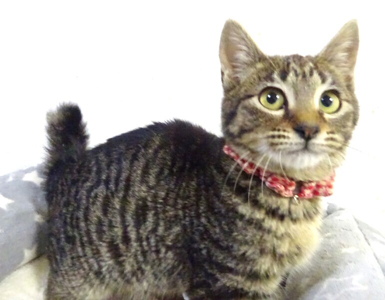 | 特徴(性格など) | 仮名: いちごちゃん、メス 毛色: キジトラ、尻尾短め 性格: 初めて会った人でも抱っこ出来ます。 3兄弟(ひろくん、桜子ちゃん、いちごちゃん)の中で、一番人懐っこい性格かと思います。 ケージに近づくと寄ってきますし、威嚇なく抱っこしたり、爪切り、薬も大丈夫です。兄弟は仲良しなので、一緒のご縁があると嬉しいですが、そっくりなので、別々でも構いません。 いつもは完食し、元気です。 じゃらしは好きですが、兄弟が大人しいので、激しいプロレスなどはありませんが、ボールを転がしたりして遊んでいます。 お届けは千葉県内で千葉市幕張から車で1時間位が希望です。 |