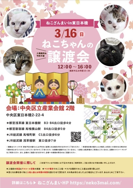 | その他(譲渡条件など) | 11:30より、2階会場入口にて受付を開始します。 受付時に入場予定時間が記入された整理券をお配り致しますので、整理券を受け取った方はお時間になりましたら2階会場入口に番号順にお並び下さい。 ※11:30より早くいらしてもお待ちいただく場所がございません。 また、近隣にお住まいの方や他階フロアのご利用者様にご迷惑となる場合がございますので、受付開始時間にあわせてお越しくださいますよう、何卒ご協力お願いいたします。 ※ねこざんまい譲渡会は、先着順で里親様を決定する譲渡会ではありません。 先に申し込みをした方を優先することもありません。 お話をして、その猫ちゃんに合ったおうちに決めさせていただいております。 12時に開場し、里親様の決定は14時以降となります。 14時以降にご入場の場合、希望の猫ちゃんが決定している可能性があります。 また1頭に対し多数のご希望をいただいた場合、早めに申し込みを締め切らせていただく場合がございますので、予めご了承下さい。 里親様決定は14時以降となります。 その後、迎え入れ準備の説明等のお時間も頂戴しますので、お時間に余裕を持ってご来場下さい。 【新型コロナウィルス感染予防対策について】 譲渡会開催に際し、ご来場下さいます皆様には以下の内容をご理解頂き、ご協力頂けます様お願い申し上げます。 ●入場前の検温とアルコール消毒の実施 ●マスク着用でのご入場=マスク未着用でのご入場はお断り致します ●入場人数の制限をさせていただきます(来場多数の場合は入れ替え制となります) ●時間と人数の制限=密になる事を防ぐ為に入場人数とお時間の制限を設けさせて頂きます その為お待たせしてしまう場合もございます ●会場利用規約により、ご来場者様の連絡先を控えさせていただきます あらかじめご了承下さい。 諸々の制限がございますが、安心・安全な譲渡会運営のためにご理解・ご協力いただきますようお願い申し上げます。 ~~~~~~~~~~~~~~~~~~~~~~~~~~~~~~ ★仔猫ご希望の里親様★ 仔猫ちゃんたちは、まだ体がしっかりしていない赤ちゃんです。 下痢だけでも数時間対応ができなかっただけ死に至る事もあります。 その為、月齢に応じたお留守番時間を設けさせていただいております。 また、子猫ちゃん(6ヶ月未満)の里親様には子猫支援金のご協力をお願い致しております。 ★猫ちゃんとのお見合いは譲渡会で!★ ねこざんまいの猫ちゃんは譲渡会でのお見合いのみとなります。 『この子はいつ譲渡会に参加するの?』『譲渡会場の場所はどこ?』などは、ねこざんまいホームページをご覧ください。 https://neko3mai.com/ ★楽しく猫ちゃんと触れ合って★ ねこざんまい譲渡会は、猫ちゃんも里親様も保護主も笑顔で過ごせる譲渡会を目指しています。 これから20年以上、楽しい時も、悲しい時もいつも傍にいてくれる大切な家族になる猫ちゃんです。 会場には沢山の猫ちゃんがいます。 1匹1匹、触れ合って猫ちゃんとお話してください。 『初めて猫ちゃんを家族に迎える方』 『先住猫ちゃんのお友達を迎える方』など トライアルの仕方や先住猫ちゃんと仲良くなるコツなど経験豊富な保護主やスタッフにお気軽にご相談ください! 猫を愛し、そして猫に愛されている猫好きスタッフと保護主がアドバイスさせていただきます。 ★里親希望のみなさまへ★ ペットではなく、家族一員としてたっぷり愛情を注いでくださるご家庭をお待ちしております。 恐れ入りますが ●学生の方、子猫・幼猫希望の60才以上の方のみのご家庭 ●脱走防止対策にご協力いただけない方 は原則譲渡を遠慮させていただいております。 ●一人暮らし・同棲(事実婚)の方 保護主の希望や猫の年齢・性格等により、ご希望に添えない場合もございます。 参加猫ちゃんは、それぞれ保護主(実際に猫ちゃんを自宅に入れ、保護をしている方)が異なります。 詳しい条件なども異なる場合がございますので、会場内で直接保護主とお話ください。 〖共通条件〗 1.終生飼育 2.完全室内飼い 3.脱走防止対策へのご協力 4.避妊去勢手術 5.契約書類へのサイン 6.定期報告 7.医療費等の負担 当日の猫ちゃんを連れて帰ることはできません。後日、保護主が里親様のご自宅までお届け致します。 その為、移動の際の猫ちゃんの負担を月齢などから考慮し、お届け地区を限定させて頂くこともございますのでご了承ください。 ご理解とご協力のほど宜しくお願い致します。 ☆よくある質問☆ ・譲渡の条件 ・ご負担頂く費用 ・譲渡会の場所等は ホームページに詳しく掲載させて頂いておりますのでご覧ください。 https://neko3mai.com/ メールでのお問い合わせはすぐにご返答出来ない場合がございますのでご了承ください。 ホームページ https://neko3mai.com/ お問い合わせ http://www.neko3mai.com/contact/form_general.html ねこざんまいブログ http://ameblo.jp/neko3mai/ |