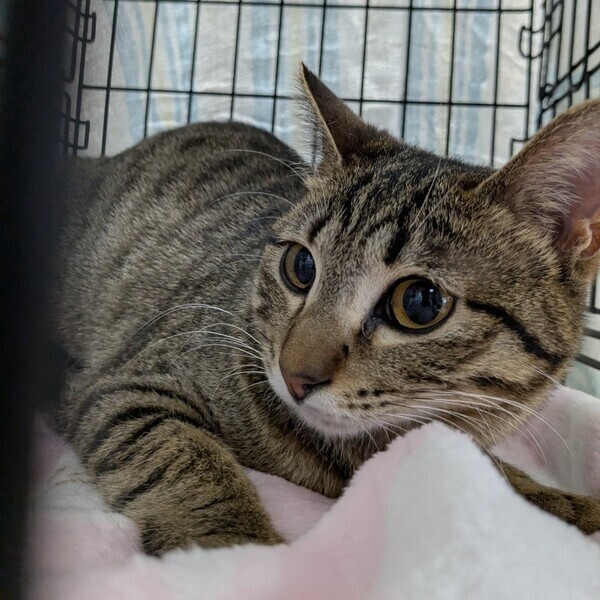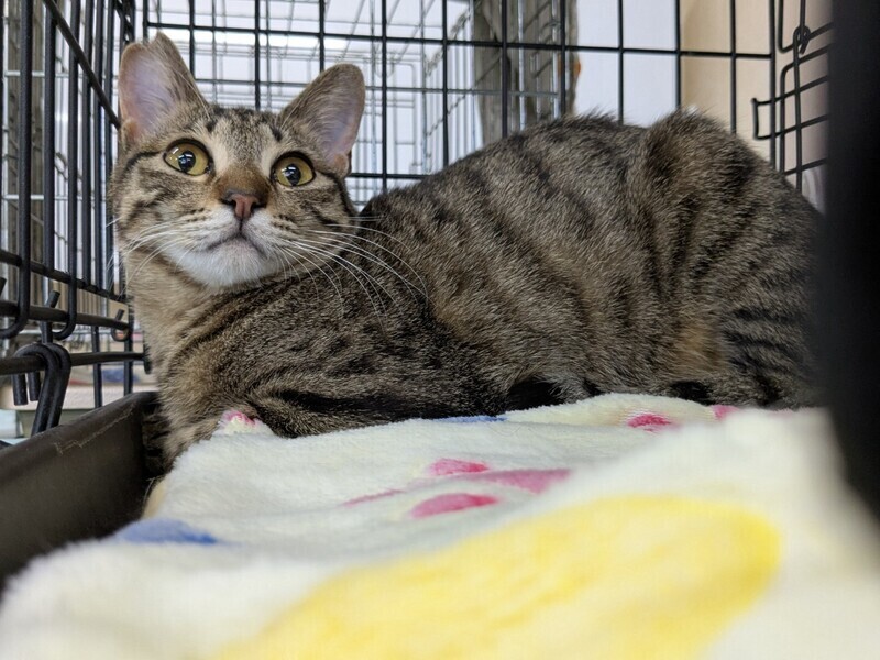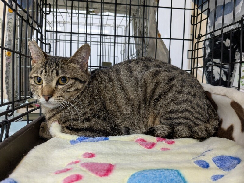 | 特徴(性格など) | キジトラでしっぽの先は少し曲がってくるっとしています。 臆病なところがあり保護した頃は人から逃げて隅っこに隠れていました。 最近では膝の上に乗って甘えるしぐさもあります。 保護猫仲間と暮らしてきたので先住猫さんといると 環境に慣れやすいと思います。 |