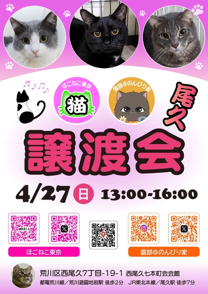 | その他(譲渡条件など) | 4/27(日) 13:00~16:00 西尾久の譲渡会でお見合いできます。 家族としてお迎えいただきたいので、特別な場合を除き、ご家族お揃いでお越しいただきますようお願いいたします。当日猫を連れて帰る事はできません。 会場:西尾久七本町会会館 荒川区西尾久7丁目-19-1 都電荒川線 荒川遊園地前駅 徒歩2分 JR東北本線 尾久駅 徒歩7分 ---------- 猫によっては20年超と長生きする子もいますので、最後まで責任を持って飼育できるか、年齢、体力、経済力、時間の余裕など、よくお考えになりお申し込みください。基本条件に合わない方のお申し込みは受け付けておりません。 トライアルの決定は譲渡会終了後に検討せていただき、後日ご連絡いたします。 保護主の希望や猫にとって合わない生活環境と思われる場合はお断りさせて頂くことがございます。お申し込み金の返金は致しませんので、あらかじめご了承ください。 基本条件は下記をご覧ください https://satoya-boshu.net/event/detail.php?@DB_ID@=7680 ---------- <ご確認ください> 脱走や危険防止対策を施した、整理整頓された清潔な環境づくりをお願いしております。間取り図や玄関やベランダなどの出入りがわかる写真または動画etcをお持ちいただくと、安全対策のアドバイスがしやすいです。 フード、キャリー、ケージ、トイレなど、一部の準備品を指定させていただいております。詳しくはお見合い会場にてご質問ください。 ===== ★お問い合わせの際は下記の質問にご協力をお願い致します。 ①お住まいの市区町村(例⇒〇〇県〇〇市・〇〇区) ②家族構成(本人含む、続柄・年齢) & 家族に受け入れ反対の方は居ませんか? ③動物の飼育経験(いつ頃・何年間) ④先住動物の有無(種別・年齢・性別・性格・猫の場合はフードの名前etc…) ⑤飼育環境( 例⇒戸建て/マンション・自己所有/賃貸) ⑥ご自宅の間取り・予定飼育スペース(基本的に全室フリーを希望していますが、ワークスペースなど入れないお部屋があるお家はお知らせください) ⑦猫さんのお留守番時間の有無(例⇒〇時~〇時・〇曜日~〇曜日に〇時間etc…) ⑧猫さんを家族に迎え入れようと思った切っ掛け。 ⑨喫煙者の有無(有りの方はどこで喫煙しますか?) ⑩ご家族に猫アレルギーの方は居ませんか?(検査をされた事はありますか?) ⑪脱走防止対策は必須になります。 対策はしていただけますか?⬇ ★玄関⇒最重要!二重扉ではない場合二重扉に匹敵する扉(柵)の設置。 ★掃き出し窓・換気をする窓⇒突っ張り棒+ワイヤーネット。それに準ずるものの設置。 ※網戸にする場合も網に直接触れない対策が必要です。網戸ロックだけでは、破いたり外したりして脱走してしまいます! ※「今までそんな猫は居なかったから大丈夫…」は、全ての猫さんに当てはまるものでは有りません。過信は禁物です、不幸になるのは猫さんです。 ★当日もアンケート&お申込用紙に同じような内容のご記入をお願いしております。何度も恐縮ですが…全て猫さんの幸せの為…ご希望者様とのマッチングの為に必要な事柄ですので、申し訳ありませんが宜しくお願い致します(⁎ᴗ͈ˬᴗ͈⁎) |