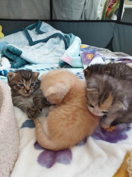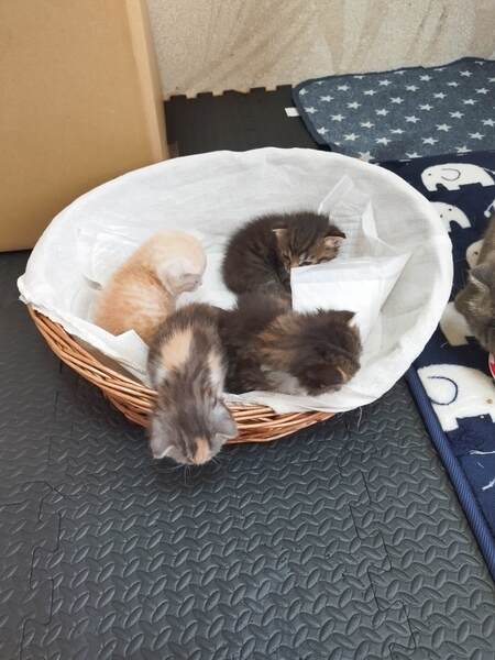 | その他(譲渡条件など) | 子猫はまだ自力排泄はできないので、おしりふきなどで、排泄促しが必要です。 現在離乳食に移行しており、ピュリナ子猫用をお湯でふやかし猫用粉ミルクを混ぜて食べさせています。 はじめの一口だけ口をひらかせ、口に少量入れたあと、指に離乳食をのせて口元に運ぶと食べます。 ①クリーム色の子は、はじめ一口口にいれて、その後はお皿から離乳食食べます。 ③のパステルカラー三毛ちゃんも、一口だけお口に入れてあげると、お皿から食べるときあります。 |