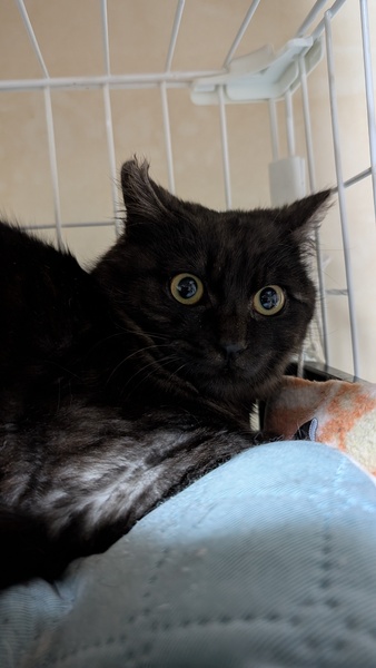 | 特徴(性格など) | 黒猫に見えますが、ブラックスモークタビーという毛色で根元は白く、身体に縞模様があります。 ビビリですが、人へ攻撃はしません。 シャーはしますが、大人しく身体を固くする程度です。 慣れるまで少し時間がかかるかもしれません。 |
