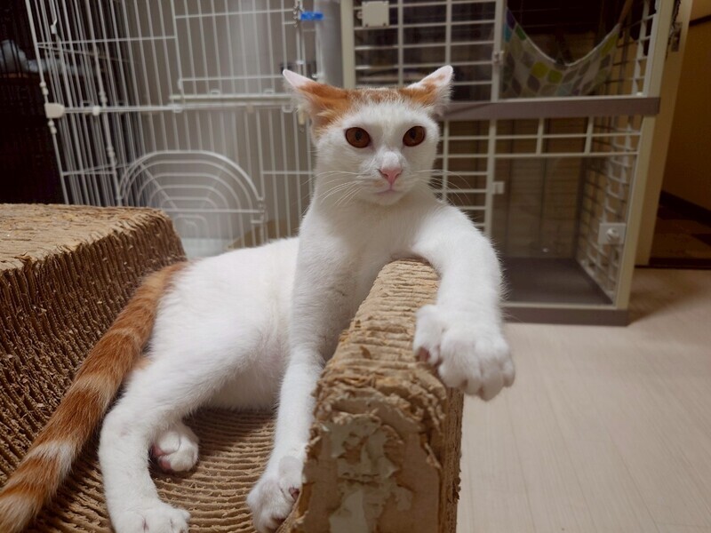 | 特徴(性格など) | 2024.9.1生まれ(推定) 毛色:茶白 パッツン前髪がかわいい 茶四郎。 甘えん坊さんで、寝転ぶと走ってお腹の上に乗ってきます!! でも気分が乗らない時の抱っこは ウーって言っちゃいます笑 顔を舐めるのが好きなようです。ちょっと痛いです。でもかわいいです!! |