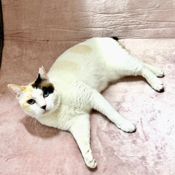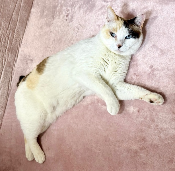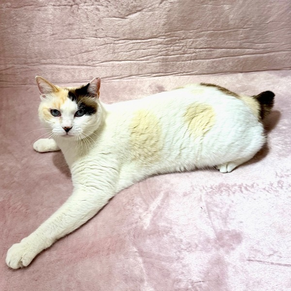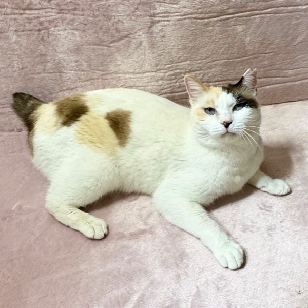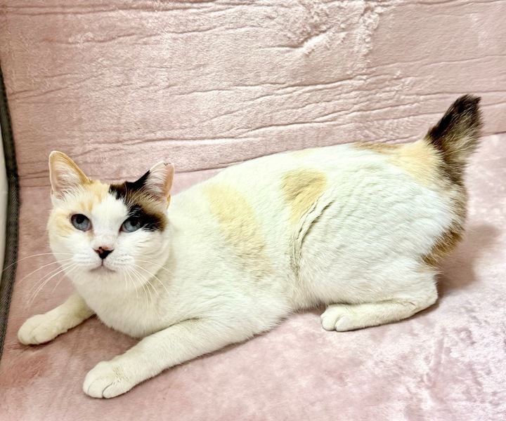 | 特徴(性格など) | 【仮名】なるちゃん 【性格】澄んだ水色の瞳のなるちゃん☆ 淡いクリーム色とこげ茶の入った飛び三毛柄の女の子です。 洋猫顔に短い尻尾もとってもキュート! 性格は誰にでもスリゴロの甘えん坊で撫でられるのが大好きで、 スリスリベタベタとくっついてきます。 1匹でべったり過ごすのが向いてるので1匹飼育を希望します。 ※1ピキ譲渡可 |