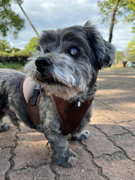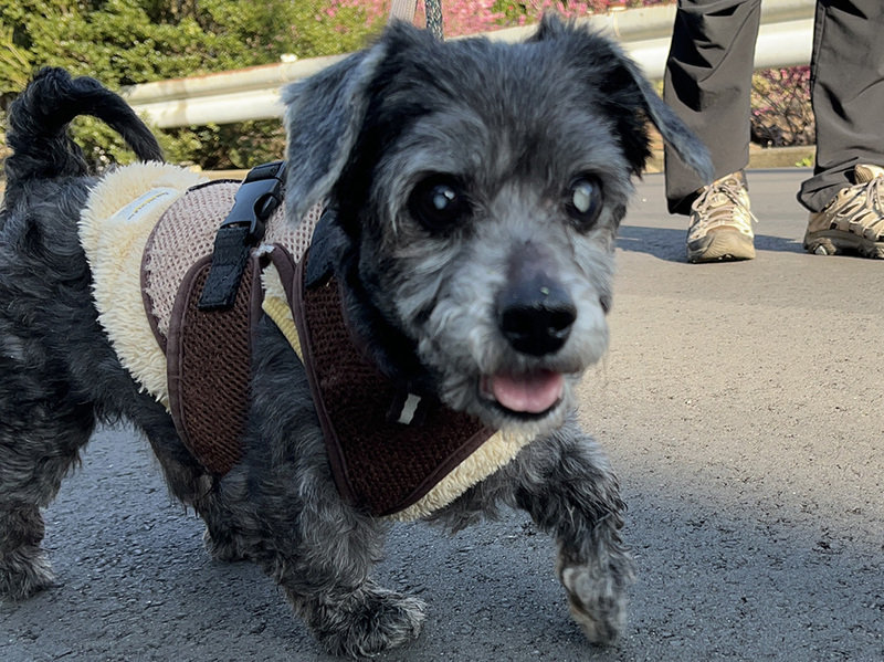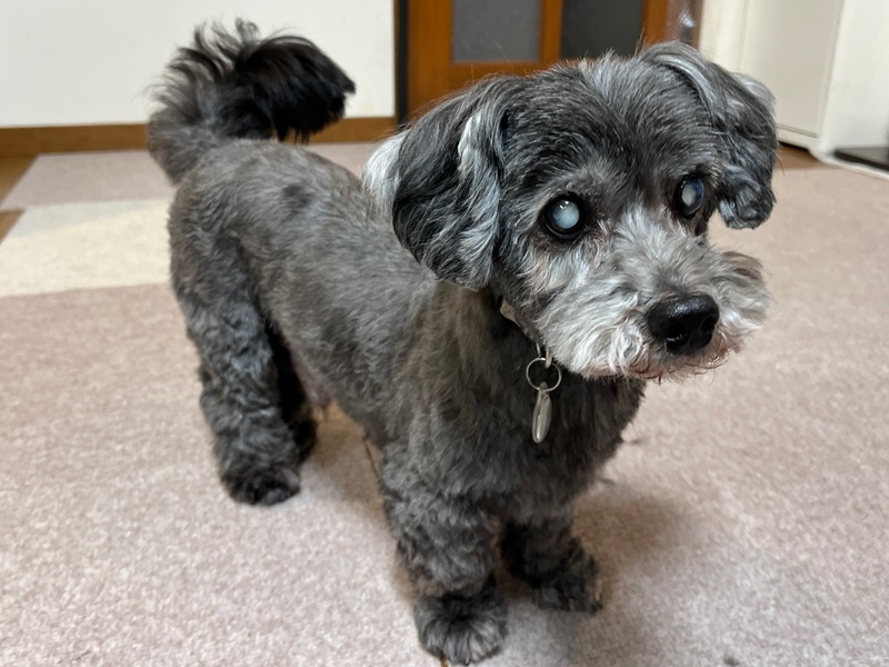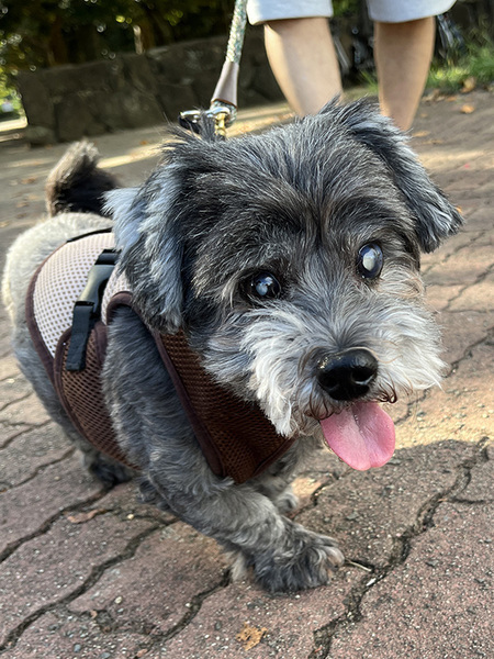 | 特徴(性格など) | ★☆性格☆★ 見た目とは裏腹に(?)、とっても甘えん坊です。 ソファに上ってきて体をすりつけてきては、座っている人間の上に乗っかってきたり、横にピタッと寄り添ってスヤスヤ寝たり。人間が離れるとすぐに起きて所在を確認するほどです。 それくらいの甘えん坊なので、人が外出すると遠吠えします。ひとりでいることに寂しさを感じるタイプです。 ===== ぶんたは、白内障が進んでいるため目がほとんど見えていません。ただ、そんなハンデを感じさせないくらいいろんなところを歩き回りますし、好奇心旺盛で物怖じなどもいっさいありません。 目が見えないぶん聴力がとても良く、呼べばすぐに寄ってきてくれますし、言葉でのコミュニケーションは取りやすいです。 そして、どのようなケアに対しても従順で、誰がおこなっても大人しく受け入れてくれます。耳掃除と歯磨きは好きではないものの、嫌がって困るようなことは何もありません。 ★☆ごはん☆★ 選り好みがまったくなく、何でも残さずによく食べます。 健康状態の項で後述しますが、皮膚トラブルが起こりやすく、チキンと牛の食物アレルギーの可能性があります。そのため、今はそれ以外をタンパク源とした食べ物を与えています。 ===== 去勢手術時に状態の悪い歯を抜く処置もしてもらっており、上の犬歯や奥歯はほとんど残っていない状態です。それでも食欲は旺盛で、残った歯で上手に噛み砕いて…とにかくよく食べます(笑)。 ★☆散歩☆★ 毎日の散歩はウキウキな感じで、よく歩きます。 目がほとんど見えていないため音とニオイだけが頼りですが、それにしてもよく歩きます。 ただ、心臓に負担がかかるような散歩は避けないと…なので(「健康状態」の項で後述)、急な坂道は迂回したり。また、獣医師によると「時間は30分程度で良いのでは」とのことで、朝晩30分ずつではありますが、本人はそれで満足そうです。 ちなみに…散歩後、家に入るまでに足拭きをするんですが、そのときのぶんたが大人しくてとってもいいコ!散歩前に服を着るのも、なんなら自分から足を通してくるくらいで、お世話のしやすさは満点です!! ★☆トイレ☆★ おしっこ、うんちともに外派です。そのため、朝晩1日2回の散歩は必須です。 ちなみにぶんた、雨が嫌いで、雨天時の散歩はテンションがとても低いです?それでもおしっこ&うんちは外…なので、散歩は必須となります。 ただ、おしっこもうんちも散歩に出て割と早めに済ませてくれます。 ★☆留守番☆★ 現在のところ留守番の最長時間は5時間程度。誤飲や粗相をすることもなく、フリーで過ごすことはできますが、人がいなくなるとしばらくは遠吠えしたり鼻鳴きします。 その状態に疲れると(?)吠えたり鳴いたりは減りますが(なくなりはしません)、そわそわと落ち着かない様子。分離不安と言って良いと思われます。 現在、クレートトレーニングをおこなっており、クレートそのものへの抵抗はありません。ひとりでも落ち着いて過ごせるように、少しずつ練習を続けています。 ★☆他の犬との関係性☆★ 現在、同居しているまることはつかず離れず適度な距離感で過ごせていますし、ケンカしたりすることもありません。 時期によって新入りを迎えることもあるのですが、他のコが来たときも普段の様子と変わることなく、とても穏やかに過ごせています。 ただ、散歩時に出会う犬に関しては、相性にもよりますが相手が犬だと認識すると「ガウッ」とひと唸りすることがあります。 ※目があまり見えず鼻もあまり良くないので、自分から他の犬に気づいて近づいていったりすることはほとんどありません。 ★☆健康状態☆★ 性格の項でも触れているように、白内障がかなり進行しており、目は光は感じている様子ですがほとんど見えていません。 また、血液検査、腹部と心臓のエコー検査の結果、主に気になるのは以下の2点です。 ★僧帽弁閉鎖不全症ステージB2 心雑音と僧帽弁逆流、心拡大があり、ステージとしてはB2。 現状はフォルテコールとピモベハートを服用していて、今後も継続的な投薬と定期的な検査が必要です(現在は半年ごとに心エコー検査を受けています)。 なお、2025年9月の検査では病状は進行しておらず、状態を維持できていました。 ★マラセチア皮膚炎 保護当時、皮膚と耳の中の状態が悪く、とくに足先のマラセチアの症状が重かったのですが、薬の塗布や定期的なマラセチア用シャンプーなどで改善されました。今はマラセチア菌はいない状態です。 ただし、マラセチアは再発しやすいので、日常的に皮膚の状態を清潔に保っておくなどのケアが必要です。 また、皮膚のかゆみが起こりやすいため、状態に応じて内服薬と塗り薬でかゆみをコントロールしています。 なお、耳アカの分泌が多く、耳が汚れやすいです。現在は、獣医師の指示により、2日に1回の保護宅での耳そうじに加えて月1回の通院時に病院で奥の方まで耳そうじをしてもら