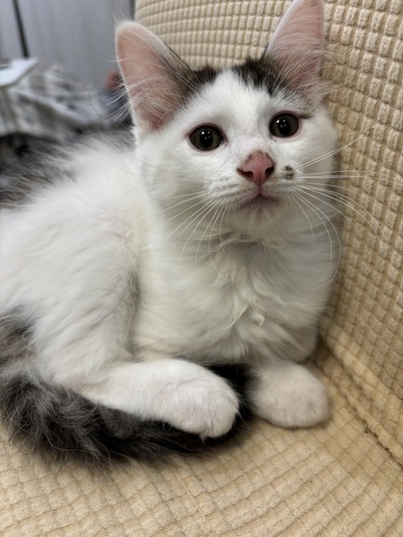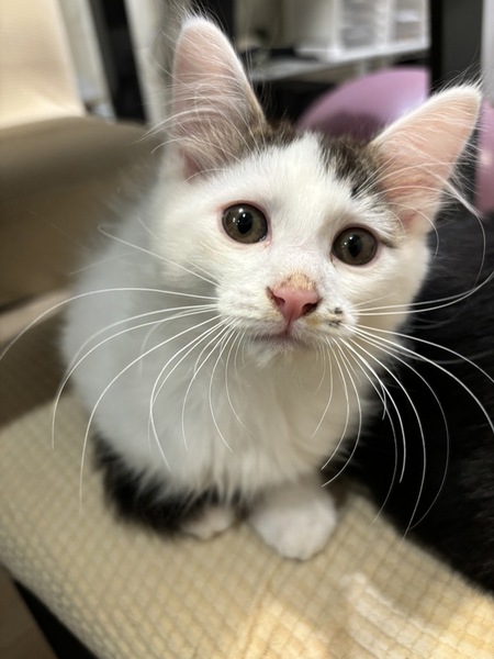 | 特徴(性格など) | 白黒ちゃんで白が多い変わった柄の子猫ちゃんです。 人慣れしてます。 トイレも完璧です。 少し毛が長毛になるかも知れません。 ヤンチャっ子です。 |