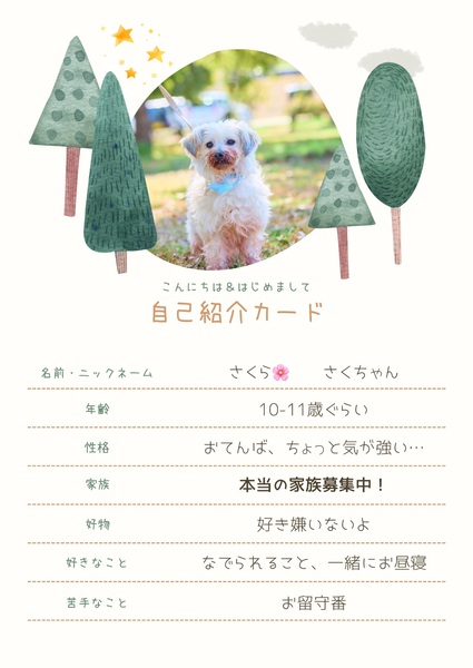 | 特徴(性格など) | 仮名:さくら マルチーズ✖️ヨーキー?の女の子 推定10〜11才 明るい性格で食いしん坊です ちょっと気が強いので、先住犬、猫がいる場合は注意が必要な場合があります 躾は入っていません クレート、ケージ、お留守番が苦手です 気長に躾に取り組んでくださり、お留守番の少ないお家を希望します |