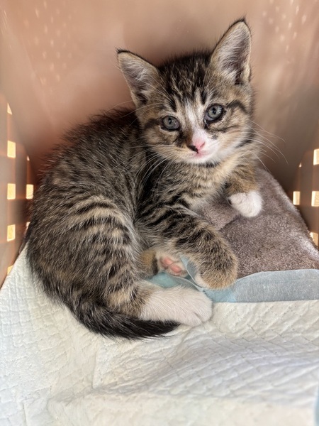 | 特徴(性格など) | 両手足に靴下をはいた女の子 長めの毛がふわっふわのキジトラちゃん。 生後1ヶ月程度の大きさです。 体:600g 4/17現在 遊び好きで、おしゃべりなようです。 可愛い声でよく鳴いています。 |