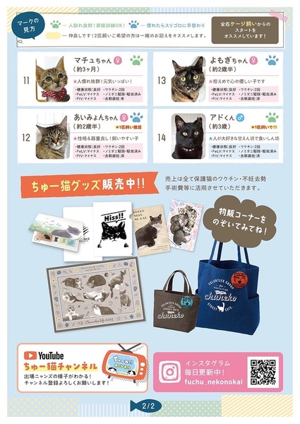 | その他(譲渡条件など) | ୨୧⌒⌒⌒⌒⌒⌒⌒⌒⌒⌒⌒⌒⌒⌒⌒୨୧ 府中駅直結⭐︎譲渡会のお知らせ ୨୧⌒⌒⌒⌒⌒⌒⌒⌒⌒⌒⌒⌒⌒⌒⌒୨୧ 【 日時 】4月27日(日)13時〜15時半まで 【 場所 】LIGHT UP LOBBY (ホテル ケヤキゲート 東京府中2F) ※混雑時は整理券を配布。ご予約は必要ありません。 https://chuneko.exblog.jp/32603337/(会場へのご案内) ※会場への直接のお問い合わせはお控えください。 ご質問はfuchu_nekonokai@yahoo.co.jpまで こんにちは。『NPO法人府中猫の会』です。 地元のTNR活動&保護活動(野良猫を増やさない取り組みや行き場のない猫達の保護)に尽力しているボランティア団体です。 その他にも当ボランティアの取り組みとして、地方の行き場のない猫達の保護にも力をを入れております。 今まで『熊本殺処分STOPプロジェクト』を掲げて約200匹の猫達を空輸して来ました。 そして、今現在は『沖縄プロジェクト』に着手しております。現在沖縄(やんばる地区)から20匹を空輸して来ました。 今回の譲渡会でご紹介する子達は沖縄っ子達ばかりが参加します。 みんな、どの子も行き場のない子達ばかりです。 一生の家族を求めて譲渡会に出場しますのでどうぞよろしくお願い申し上げます。 ◉大きめ子猫は去勢or避妊手術済み。 ◉参加する猫達はみんなお留守番が長時間OK。お仕事をフルタイムでお持ちのご家庭でも問題なく迎えていただけます。 自信を持って、この度もかわいい子ども達をご紹介させていただきます! 血液検査、ワクチン2回接種、マイクロチップ装着、全ての医療を終えております。ご安心ください。 活動内容や保護猫達の様子が気になる方は、ぜひ!YouTubeちゅー猫チャンネルをご視聴ください。 ↓↓↓ ฅ^•ﻌ•^ฅ♡ちゅー猫チャンネル https://youtube.com/@chuneko 【 よくあるご質問 】 ◆猫を飼いたい。でも保護猫ってハードルが高い気がする… その点はご安心ください。出場する全ての猫達はみんな家猫訓練を受けており、トイレ訓練もパーフェクトな猫達です。 猫飼い初心者OKな猫ちゃんも多数出場します。 ◆60歳を超えているが、猫を迎えたい。 今時の60代様、70代様は、大変お若くアグレッシブでいらっしゃいます! そんな方々にはぜひ成猫さんをオススメさせていただきます。 今回出場する成猫さんは、捨てられた子達ばかりです。(多頭崩壊、飼育放棄、夜逃げによる強制執行) みんな心に傷を負っている子達を保護しております。しばらく心のケアや家猫訓練をバスした子達を出場させますので、ぜひ!会いに来てください。 ※60歳以上の方は後継人をお願いしております。後継人の方とご来場いただくと私達も選考しやすいのでよろしくお願いします。 ◆わが子の為にも保護猫を迎えたい!しかし、私達家族一同、猫を飼うのは初めてです。どうしたらいいですか? そのようなご家庭こそぜひ!お待ちしております! 猫ちゃんの魅力を知っていただきたいのと、お子様が保護猫達と一緒に育つ事により『命に優しい情操教育』となると願っている当会です。 喜んでお待ちしております。 ※猫アレルギー問題があります。初めて猫を飼う方は猫アレルギー検査を事前にしていただくと私達も選考しやすいです。 特にお子様には必ず検査をお願いします。 ◆仕事があって、お留守番をさせるのが心配… ご心配はご無用です! 今回出場する子達はみんな成猫さんなので、一日フルタイムでお仕事をお持ちのご家庭でも問題なく迎えていただける子達ばかりです。 【 譲渡会にご参加くださる方々へ 】 ₍ᐞ•༝•ᐞ₎◞ ̑̑ ◎混雑を防ぐ為、入場制限をさせていただきますが、ご予約の必要はございません。 入り口カウンターにてスタッフが整理券を配布いたしますのでご協力お願い申し上げます。 ₍ᐞ•༝•ᐞ₎◞ ̑̑ ◎初めて猫ちゃんを迎える方(特にお子様のいるご家庭)は、猫アレルギーの有無を明確にしてくださると選考しやすいです。 ₍ᐞ•༝•ᐞ₎◞ ̑̑ ◎譲渡会はお見合いのみの場となっております。 ご来場前に必ず下記の事項をご参照ください。 ▶︎譲渡会のシステムについて◀︎ https://chuneko.exblog.jp/32604872/ 【見学希望やご支援者の方々へ】 ₍ᐞ•༝•ᐞ₎◞ ̑̑ いつもありがとうございます♡ 会場はホテルのカフェとなっております。 お飲み物をご注文くださればお席にご案内いたします。(入口スタッフに一言お申し出ください。) 大変申し訳ないのですが、里親希望の方々を優先的にご案内させていただくのをご了承の上、お越し下されば幸いです。 会場では、ちゅー猫オリジナルグッズも販売しております。 普段、ネットで販売している公式グッズの現物をお手に取ってご覧いただけます。 |