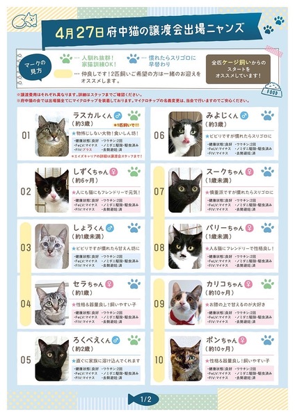 | その他(譲渡条件など) | ୨୧⌒⌒⌒⌒⌒⌒⌒⌒⌒⌒⌒⌒⌒⌒⌒୨୧ 府中駅直結⭐︎譲渡会のお知らせ ୨୧⌒⌒⌒⌒⌒⌒⌒⌒⌒⌒⌒⌒⌒⌒⌒୨୧ 【 日時 】4月27日(日)13時〜15時半まで 【 場所 】LIGHT UP LOBBY (ホテル ケヤキゲート 東京府中2F) ※混雑時は整理券を配布。ご予約は必要ありません。 https://chuneko.exblog.jp/32603337/(会場へのご案内) ※会場への直接のお問い合わせはお控えください。 ご質問はfuchu_nekonokai@yahoo.co.jpまで こんにちは。『NPO法人府中猫の会』です。 地元のTNR活動&保護活動(野良猫を増やさない取り組みや行き場のない猫達の保護)に尽力しているボランティア団体です。 その他にも当ボランティアの取り組みとして、地方の行き場のない猫達の保護にも力をを入れております。 今まで『熊本殺処分STOPプロジェクト』を掲げて約200匹の猫達を空輸して来ました。 そして、今現在は『沖縄プロジェクト』に着手しております。現在沖縄(やんばる地区)から20匹を空輸して来ました。 今回の譲渡会でご紹介する子達は沖縄っ子達ばかりが参加します。 みんな、どの子も行き場のない子達ばかりです。 一生の家族を求めて譲渡会に出場しますのでどうぞよろしくお願い申し上げます。 ◉大きめ子猫は去勢or避妊手術済み。 ◉参加する猫達はみんなお留守番が長時間OK。お仕事をフルタイムでお持ちのご家庭でも問題なく迎えていただけます。 自信を持って、この度もかわいい子ども達をご紹介させていただきます! 血液検査、ワクチン2回接種、マイクロチップ装着、全ての医療を終えております。ご安心ください。 活動内容や保護猫達の様子が気になる方は、ぜひ!YouTubeちゅー猫チャンネルをご視聴ください。 ↓↓↓ ฅ^•ﻌ•^ฅ♡ちゅー猫チャンネル https://youtube.com/@chuneko 【 よくあるご質問 】 ◆猫を飼いたい。でも保護猫ってハードルが高い気がする… その点はご安心ください。出場する全ての猫達はみんな家猫訓練を受けており、トイレ訓練もパーフェクトな猫達です。 猫飼い初心者OKな猫ちゃんも多数出場します。 ◆60歳を超えているが、猫を迎えたい。 今時の60代様、70代様は、大変お若くアグレッシブでいらっしゃいます! そんな方々にはぜひ成猫さんをオススメさせていただきます。 今回出場する成猫さんは、捨てられた子達ばかりです。(多頭崩壊、飼育放棄、夜逃げによる強制執行) みんな心に傷を負っている子達を保護しております。しばらく心のケアや家猫訓練をバスした子達を出場させますので、ぜひ!会いに来てください。 ※60歳以上の方は後継人をお願いしております。後継人の方とご来場いただくと私達も選考しやすいのでよろしくお願いします。 ◆わが子の為にも保護猫を迎えたい!しかし、私達家族一同、猫を飼うのは初めてです。どうしたらいいですか? そのようなご家庭こそぜひ!お待ちしております! 猫ちゃんの魅力を知っていただきたいのと、お子様が保護猫達と一緒に育つ事により『命に優しい情操教育』となると願っている当会です。 喜んでお待ちしております。 ※猫アレルギー問題があります。初めて猫を飼う方は猫アレルギー検査を事前にしていただくと私達も選考しやすいです。 特にお子様には必ず検査をお願いします。 ◆仕事があって、お留守番をさせるのが心配… ご心配はご無用です! 今回出場する子達はみんな成猫さんなので、一日フルタイムでお仕事をお持ちのご家庭でも問題なく迎えていただける子達ばかりです。 【 譲渡会にご参加くださる方々へ 】 ₍ᐞ•༝•ᐞ₎◞ ̑̑ ◎混雑を防ぐ為、入場制限をさせていただきますが、ご予約の必要はございません。 入り口カウンターにてスタッフが整理券を配布いたしますのでご協力お願い申し上げます。 ₍ᐞ•༝•ᐞ₎◞ ̑̑ ◎初めて猫ちゃんを迎える方(特にお子様のいるご家庭)は、猫アレルギーの有無を明確にしてくださると選考しやすいです。 ₍ᐞ•༝•ᐞ₎◞ ̑̑ ◎譲渡会はお見合いのみの場となっております。 ご来場前に必ず下記の事項をご参照ください。 ▶︎譲渡会のシステムについて◀︎ https://chuneko.exblog.jp/32604872/ 【見学希望やご支援者の方々へ】 ₍ᐞ•༝•ᐞ₎◞ ̑̑ いつもありがとうございます♡ 会場はホテルのカフェとなっております。 お飲み物をご注文くださればお席にご案内いたします。(入口スタッフに一言お申し出ください。) 大変申し訳ないのですが、里親希望の方々を優先的にご案内させていただくのをご了承の上、お越し下されば幸いです。 会場では、ちゅー猫オリジナルグッズも販売しております。 普段、ネットで販売している公式グッズの現物をお手に取ってご覧いただけます。 |