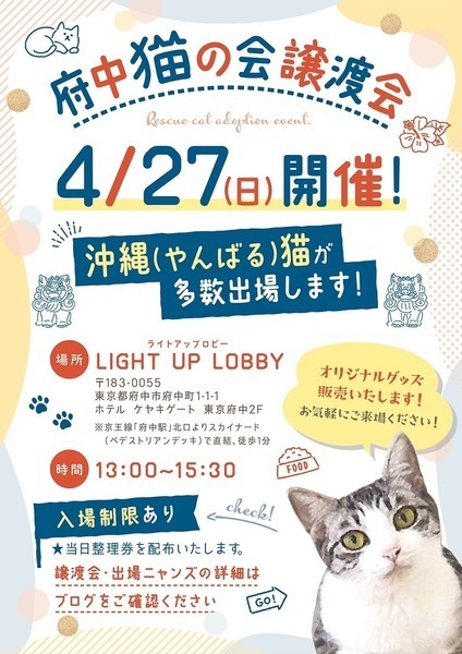 | その他(譲渡条件など) | ୨୧⌒⌒⌒⌒⌒⌒⌒⌒⌒⌒⌒⌒⌒⌒⌒୨୧ 府中駅直結⭐︎譲渡会のお知らせ ୨୧⌒⌒⌒⌒⌒⌒⌒⌒⌒⌒⌒⌒⌒⌒⌒୨୧ 【 日時 】4月27日(日)13時〜15時半まで 【 場所 】LIGHT UP LOBBY (ホテル ケヤキゲート 東京府中2F) ※混雑時は整理券を配布。ご予約は必要ありません。 https://chuneko.exblog.jp/32603337/(会場へのご案内) ※会場への直接のお問い合わせはお控えください。 ご質問はfuchu_nekonokai@yahoo.co.jpまで こんにちは。『NPO法人府中猫の会』です。 地元のTNR活動&保護活動(野良猫を増やさない取り組みや行き場のない猫達の保護)に尽力しているボランティア団体です。 その他にも当ボランティアの取り組みとして、地方の行き場のない猫達の保護にも力をを入れております。 今まで『熊本殺処分STOPプロジェクト』を掲げて約200匹の猫達を空輸して来ました。 そして、今現在は『沖縄プロジェクト』に着手しております。現在沖縄(やんばる地区)から20匹を空輸して来ました。 今回の譲渡会でご紹介する子達は沖縄っ子達ばかりが参加します。 みんな、どの子も行き場のない子達ばかりです。 一生の家族を求めて譲渡会に出場しますのでどうぞよろしくお願い申し上げます。 ◉大きめ子猫は去勢or避妊手術済み。 ◉参加する猫達はみんなお留守番が長時間OK。お仕事をフルタイムでお持ちのご家庭でも問題なく迎えていただけます。 自信を持って、この度もかわいい子ども達をご紹介させていただきます! 血液検査、ワクチン2回接種、マイクロチップ装着、全ての医療を終えております。ご安心ください。 活動内容や保護猫達の様子が気になる方は、ぜひ!YouTubeちゅー猫チャンネルをご視聴ください。 ↓↓↓ ฅ^•ﻌ•^ฅ♡ちゅー猫チャンネル https://youtube.com/@chuneko 【 よくあるご質問 】 ◆猫を飼いたい。でも保護猫ってハードルが高い気がする… その点はご安心ください。出場する全ての猫達はみんな家猫訓練を受けており、トイレ訓練もパーフェクトな猫達です。 猫飼い初心者OKな猫ちゃんも多数出場します。 ◆60歳を超えているが、猫を迎えたい。 今時の60代様、70代様は、大変お若くアグレッシブでいらっしゃいます! そんな方々にはぜひ成猫さんをオススメさせていただきます。 今回出場する成猫さんは、捨てられた子達ばかりです。(多頭崩壊、飼育放棄、夜逃げによる強制執行) みんな心に傷を負っている子達を保護しております。しばらく心のケアや家猫訓練をバスした子達を出場させますので、ぜひ!会いに来てください。 ※60歳以上の方は後継人をお願いしております。後継人の方とご来場いただくと私達も選考しやすいのでよろしくお願いします。 ◆わが子の為にも保護猫を迎えたい!しかし、私達家族一同、猫を飼うのは初めてです。どうしたらいいですか? そのようなご家庭こそぜひ!お待ちしております! 猫ちゃんの魅力を知っていただきたいのと、お子様が保護猫達と一緒に育つ事により『命に優しい情操教育』となると願っている当会です。 喜んでお待ちしております。 ※猫アレルギー問題があります。初めて猫を飼う方は猫アレルギー検査を事前にしていただくと私達も選考しやすいです。 特にお子様には必ず検査をお願いします。 ◆仕事があって、お留守番をさせるのが心配… ご心配はご無用です! 今回出場する子達はみんな成猫さんなので、一日フルタイムでお仕事をお持ちのご家庭でも問題なく迎えていただける子達ばかりです。 【 譲渡会にご参加くださる方々へ 】 ₍ᐞ•༝•ᐞ₎◞ ̑̑ ◎混雑を防ぐ為、入場制限をさせていただきますが、ご予約の必要はございません。 入り口カウンターにてスタッフが整理券を配布いたしますのでご協力お願い申し上げます。 ₍ᐞ•༝•ᐞ₎◞ ̑̑ ◎初めて猫ちゃんを迎える方(特にお子様のいるご家庭)は、猫アレルギーの有無を明確にしてくださると選考しやすいです。 ₍ᐞ•༝•ᐞ₎◞ ̑̑ ◎譲渡会はお見合いのみの場となっております。 ご来場前に必ず下記の事項をご参照ください。 ▶︎譲渡会のシステムについて◀︎ https://chuneko.exblog.jp/32604872/ 【見学希望やご支援者の方々へ】 ₍ᐞ•༝•ᐞ₎◞ ̑̑ いつもありがとうございます♡ 会場はホテルのカフェとなっております。 お飲み物をご注文くださればお席にご案内いたします。(入口スタッフに一言お申し出ください。) 大変申し訳ないのですが、里親希望の方々を優先的にご案内させていただくのをご了承の上、お越し下されば幸いです。 会場では、ちゅー猫オリジナルグッズも販売しております。 普段、ネットで販売している公式グッズの現物をお手に取ってご覧いただけます。 |