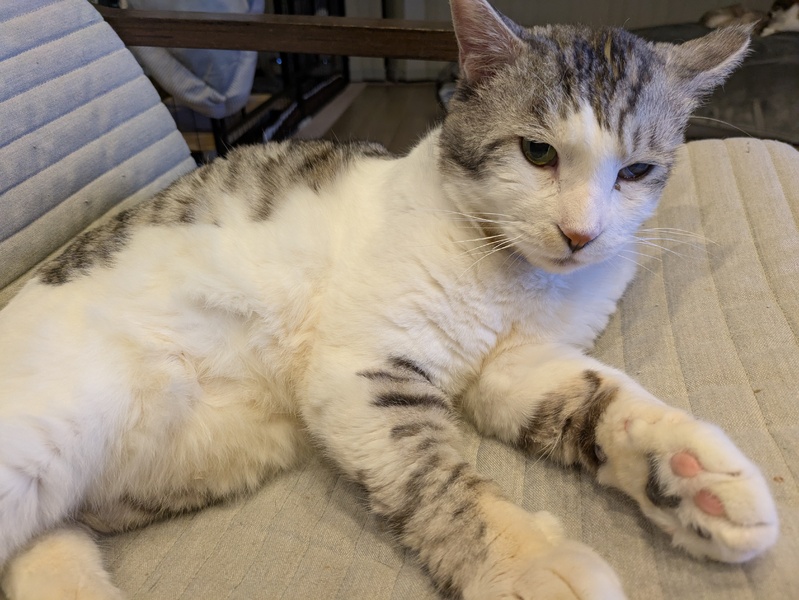 | 特徴(性格など) | 色柄 サバトラ 性格 ・大きな手術を3回も乗り越えたがんぱりさん ・甘えん坊 ・わ〜!と言うとわ〜!と答えます ・食いしん坊 ・膝抱っこが好き ・いつもついてきます ・一緒に寝れます ・猫より人が好き ・イタズラしません |