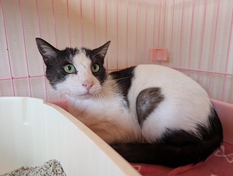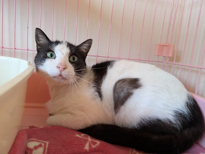 | 特徴(性格など) | 保護施設に来た初日から撫でることが出来るほど人慣れしています 癒し系にゃんこ、穏やかで大人しい男の子です 背骨は手に当たるほど痩せて頭や首など少し毛が薄くなっています 栄養失調による脱毛かもしれません |