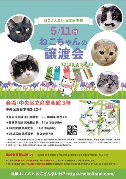 | その他(譲渡条件など) | 11:30より、3階会場入口にて受付を開始します。 受付時に入場予定時間が記入された整理券をお配り致しますので、整理券を受け取った方はお時間になりましたら2階会場入口に番号順にお並び下さい。 ※11:30より早くいらしてもお待ちいただく場所がございません。 また、近隣にお住まいの方や他階フロアのご利用者様にご迷惑となる場合がございますので、受付開始時間にあわせてお越しくださいますよう、何卒ご協力お願いいたします。 ※ねこざんまい譲渡会は、先着順で里親様を決定する譲渡会ではありません。 先に申し込みをした方を優先することもありません。 お話をして、その猫ちゃんに合ったおうちに決めさせていただいております。 12時に開場し、里親様の決定は14時以降となります。 14時以降にご入場の場合、希望の猫ちゃんが決定している可能性があります。 また1頭に対し多数のご希望をいただいた場合、早めに申し込みを締め切らせていただく場合がございますので、予めご了承下さい。 里親様決定は14時以降となります。 その後、迎え入れ準備の説明等のお時間も頂戴しますので、お時間に余裕を持ってご来場下さい。 ~~~~~~~~~~~~~~~~~~~~~~~~~~~~~~ ★仔猫ご希望の里親様★ 仔猫ちゃんたちは、まだ体がしっかりしていない赤ちゃんです。 下痢だけでも数時間対応ができなかっただけ死に至る事もあります。 その為、月齢に応じたお留守番時間を設けさせていただいております。 また、子猫ちゃん(6ヶ月未満)の里親様には子猫支援金のご協力をお願い致しております。 ★猫ちゃんとのお見合いは譲渡会で!★ ねこざんまいの猫ちゃんは譲渡会でのお見合いのみとなります。 『この子はいつ譲渡会に参加するの?』『譲渡会場の場所はどこ?』などは、ねこざんまいホームページをご覧ください。 https://neko3mai.com/ ★楽しく猫ちゃんと触れ合って★ ねこざんまい譲渡会は、猫ちゃんも里親様も保護主も笑顔で過ごせる譲渡会を目指しています。 これから20年以上、楽しい時も、悲しい時もいつも傍にいてくれる大切な家族になる猫ちゃんです。 会場には沢山の猫ちゃんがいます。 1匹1匹、触れ合って猫ちゃんとお話してください。 『初めて猫ちゃんを家族に迎える方』 『先住猫ちゃんのお友達を迎える方』など トライアルの仕方や先住猫ちゃんと仲良くなるコツなど経験豊富な保護主やスタッフにお気軽にご相談ください! 猫を愛し、そして猫に愛されている猫好きスタッフと保護主がアドバイスさせていただきます。 ★里親希望のみなさまへ★ ペットではなく、家族一員としてたっぷり愛情を注いでくださるご家庭をお待ちしております。 恐れ入りますが ●学生の方 子猫・幼猫希望の60才以上の方のみのご家庭 ●脱走防止対策にご協力いただけない方 は原則譲渡を遠慮させていただいております。 ●一人暮らし・同棲(事実婚)の方 保護主の希望や猫の年齢・性格等により、ご希望に添えない場合もございます。 参加猫ちゃんは、それぞれ保護主(実際に猫ちゃんを自宅に入れ、保護をしている方)が異なります。 詳しい条件なども異なる場合がございますので、会場内で直接保護主とお話ください。 〖共通条件〗 1.終生飼育 2.完全室内飼い 3.脱走防止対策へのご協力 4.避妊去勢手術 5.契約書類へのサイン 6.定期報告 7.医療費等の負担 当日の猫ちゃんを連れて帰ることはできません。後日、保護主が里親様のご自宅までお届け致します。 その為、移動の際の猫ちゃんの負担を月齢などから考慮し、お届け地区を限定させて頂くこともございますのでご了承ください。 ご理解とご協力のほど宜しくお願い致します。 ☆よくある質問☆ ・譲渡の条件 ・ご負担頂く費用 ・譲渡会の場所等は ホームページに詳しく掲載させて頂いておりますのでご覧ください。 https://neko3mai.com/ メールでのお問い合わせはすぐにご返答出来ない場合がございますのでご了承ください。 ホームページ https://neko3mai.com/ お問い合わせ http://www.neko3mai.com/contact/form_general.html ねこざんまいブログ http://ameblo.jp/neko3mai/ |