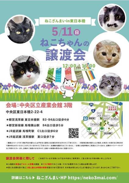 | その他(譲渡条件など) | 11:30より、3階会場入口にて受付を開始します。 受付時に入場予定時間が記入された整理券をお配り致しますので、整理券を受け取った方はお時間になりましたら2階会場入口に番号順にお並び下さい。 ※11:30より早くいらしてもお待ちいただく場所がございません。 また、近隣にお住まいの方や他階フロアのご利用者様にご迷惑となる場合がございますので、受付開始時間にあわせてお越しくださいますよう、何卒ご協力お願いいたします。 ※ねこざんまい譲渡会は、先着順で里親様を決定する譲渡会ではありません。 先に申し込みをした方を優先することもありません。 お話をして、その猫ちゃんに合ったおうちに決めさせていただいております。 12時に開場し、里親様の決定は14時以降となります。 14時以降にご入場の場合、希望の猫ちゃんが決定している可能性があります。 また1頭に対し多数のご希望をいただいた場合、早めに申し込みを締め切らせていただく場合がございますので、予めご了承下さい。 里親様決定は14時以降となります。 その後、迎え入れ準備の説明等のお時間も頂戴しますので、お時間に余裕を持ってご来場下さい。 ~~~~~~~~~~~~~~~~~~~~~~~~~~~~~~ ★仔猫ご希望の里親様★ 仔猫ちゃんたちは、まだ体がしっかりしていない赤ちゃんです。 下痢だけでも数時間対応ができなかっただけ死に至る事もあります。 その為、月齢に応じたお留守番時間を設けさせていただいております。 また、子猫ちゃん(6ヶ月未満)の里親様には子猫支援金のご協力をお願い致しております。 ★猫ちゃんとのお見合いは譲渡会で!★ ねこざんまいの猫ちゃんは譲渡会でのお見合いのみとなります。 『この子はいつ譲渡会に参加するの?』『譲渡会場の場所はどこ?』などは、ねこざんまいホームページをご覧ください。 https://neko3mai.com/ ★楽しく猫ちゃんと触れ合って★ ねこざんまい譲渡会は、猫ちゃんも里親様も保護主も笑顔で過ごせる譲渡会を目指しています。 これから20年以上、楽しい時も、悲しい時もいつも傍にいてくれる大切な家族になる猫ちゃんです。 会場には沢山の猫ちゃんがいます。 1匹1匹、触れ合って猫ちゃんとお話してください。 『初めて猫ちゃんを家族に迎える方』 『先住猫ちゃんのお友達を迎える方』など トライアルの仕方や先住猫ちゃんと仲良くなるコツなど経験豊富な保護主やスタッフにお気軽にご相談ください! 猫を愛し、そして猫に愛されている猫好きスタッフと保護主がアドバイスさせていただきます。 ★里親希望のみなさまへ★ ペットではなく、家族一員としてたっぷり愛情を注いでくださるご家庭をお待ちしております。 恐れ入りますが ●学生の方 子猫・幼猫希望の60才以上の方のみのご家庭 ●脱走防止対策にご協力いただけない方 は原則譲渡を遠慮させていただいております。 ●一人暮らし・同棲(事実婚)の方 保護主の希望や猫の年齢・性格等により、ご希望に添えない場合もございます。 参加猫ちゃんは、それぞれ保護主(実際に猫ちゃんを自宅に入れ、保護をしている方)が異なります。 詳しい条件なども異なる場合がございますので、会場内で直接保護主とお話ください。 〖共通条件〗 1.終生飼育 2.完全室内飼い 3.脱走防止対策へのご協力 4.避妊去勢手術 5.契約書類へのサイン 6.定期報告 7.医療費等の負担 当日の猫ちゃんを連れて帰ることはできません。後日、保護主が里親様のご自宅までお届け致します。 その為、移動の際の猫ちゃんの負担を月齢などから考慮し、お届け地区を限定させて頂くこともございますのでご了承ください。 ご理解とご協力のほど宜しくお願い致します。 ☆よくある質問☆ ・譲渡の条件 ・ご負担頂く費用 ・譲渡会の場所等は ホームページに詳しく掲載させて頂いておりますのでご覧ください。 https://neko3mai.com/ メールでのお問い合わせはすぐにご返答出来ない場合がございますのでご了承ください。 ホームページ https://neko3mai.com/ お問い合わせ http://www.neko3mai.com/contact/form_general.html ねこざんまいブログ http://ameblo.jp/neko3mai/ |
