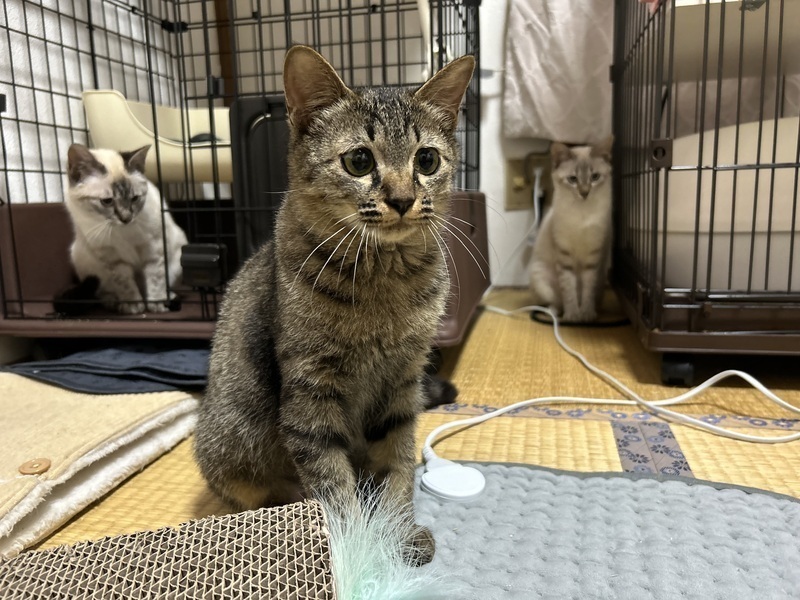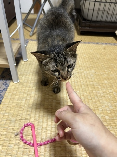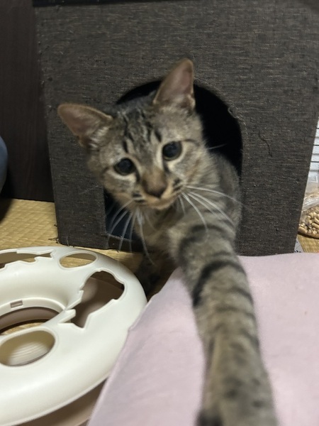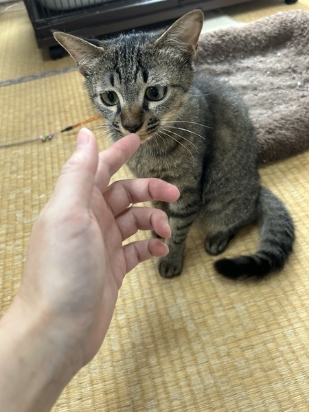 | 特徴(性格など) | ちょっと垂れ目のお顔が愛くるしい キジトラの男の子けいペー 人が大好き、いつも足や指をくんくんくんくん 寝ている時も傍でくつろいだり体の上に乗ってきます。 撫で撫で、抱っこもできて、かまって欲しくて寄ってきます。 遊ぶの大好き、おもちゃの前で待機することも。 好奇心旺盛でお客様が来た際は、こちらを気にしてひょっこり見ています。その姿が可愛いと評判です。 |