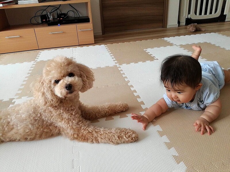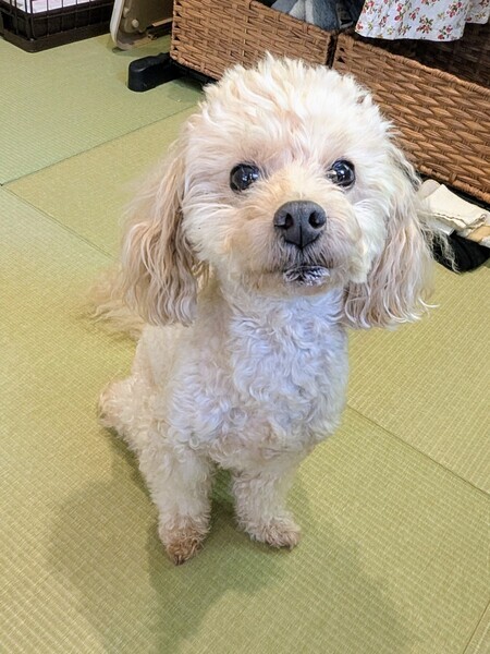 | 特徴(性格など) | トイプードルの男の子、名前は「プースケ」です。毛色はアプリコット系で、ふわふわした毛並みと元気いっぱいの姿がチャームポイントです。 人が大好きで、遊びにもとても意欲的!家の中では子どものおもちゃを見つけてきて遊んだり、食べ物を探してウロウロしたりと、いつも何か楽しいことを探している様子です。 要求吠えをする場面もありますが、散歩中に他の人や犬に対して吠えることは少なく、比較的落ち着いて歩けます。 掃除機など大きな音には敏感で吠えることがあります。 トイレは室内シートでも外でもできますが、たまに失敗も(不満があるときなど)。食糞の癖があるため、排泄後はすぐの片付けをお願いしています。 |