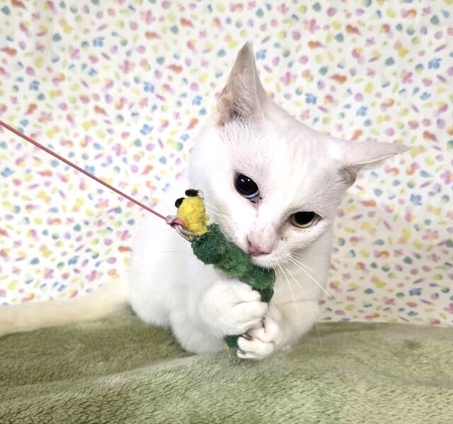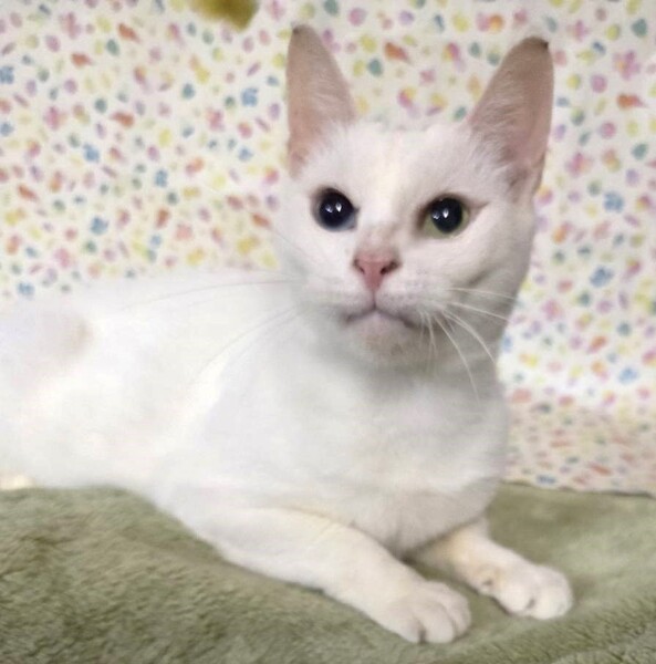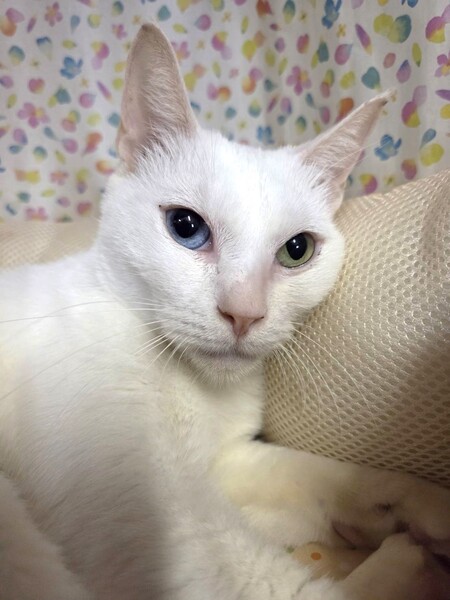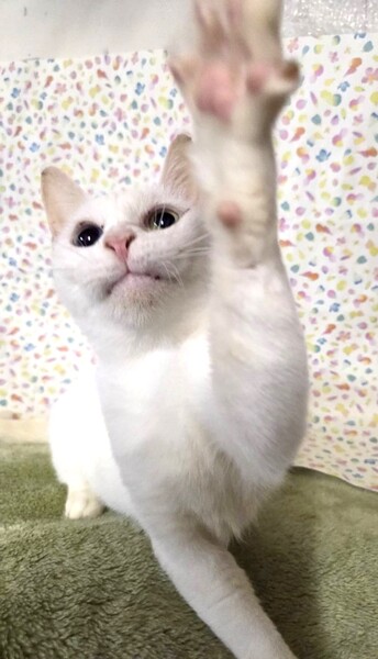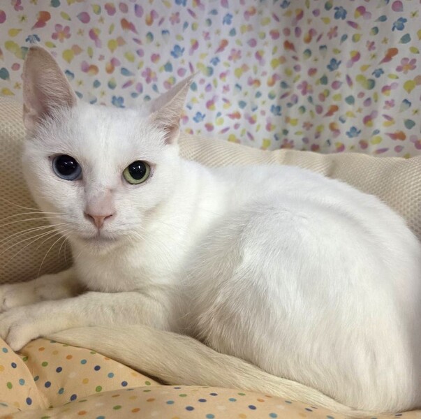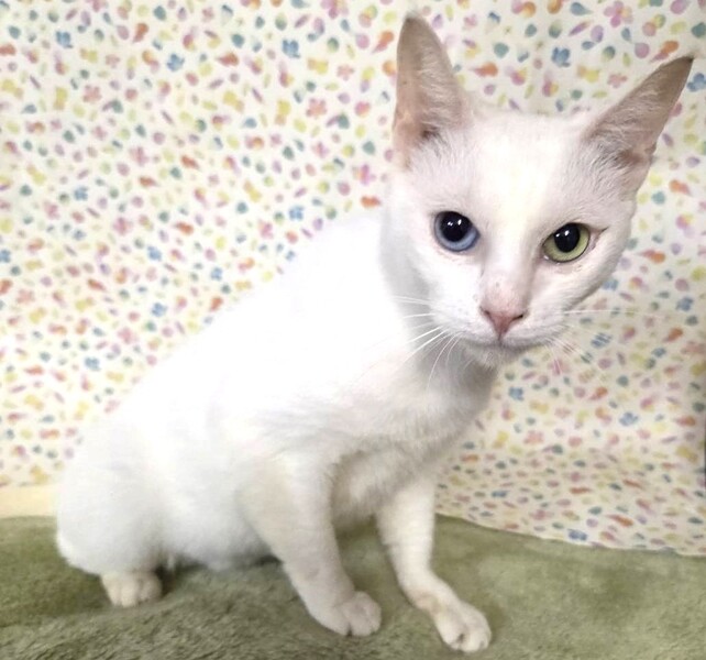 | 特徴(性格など) | 仮名: パトラちゃん、めす 毛色: 白猫、オッドアイ 性格: 人馴れしています。初めての人でも触れて撫でる事も出来ます。 手を差し出すとスリスリゴロゴロしてきます。 抱っこも出来ますが、慣れていないせいか、好きそうな感じではありません。大人しく穏やかな子です。 他の猫が様子を見にきても威嚇する事なく、ケージから手を出して呼び留めます。 多頭飼育だったので、猫との付き合いは出来ていると思います。 人にたいしても(ねえねえ、ちょっと~)と手を出してきます。 食欲はあり、ドライフードが主ですが、ウェットはおかわりするほど好きなようです。 猫じゃらしにも反応するようになりました。 トイレはきちんと使えていて失敗はありません。 検便済 駆虫済 3種混合ワクチン済 避妊手術済 猫エイズ・白血病ウィルス検査は共に陰性 |