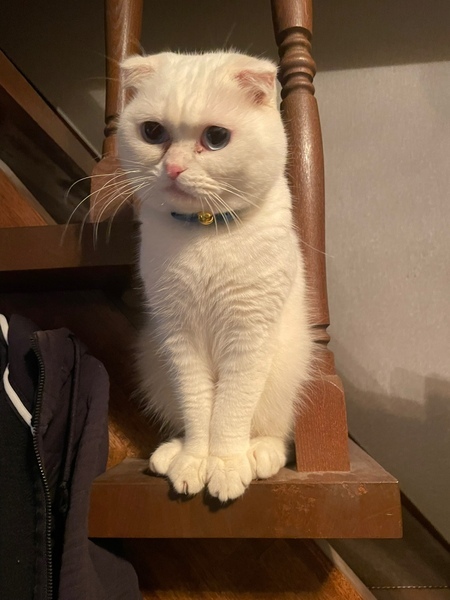 | 特徴(性格など) | 色は白で折れ耳です。 性格は大人しくて、近寄ってきてどこでもついてきます |