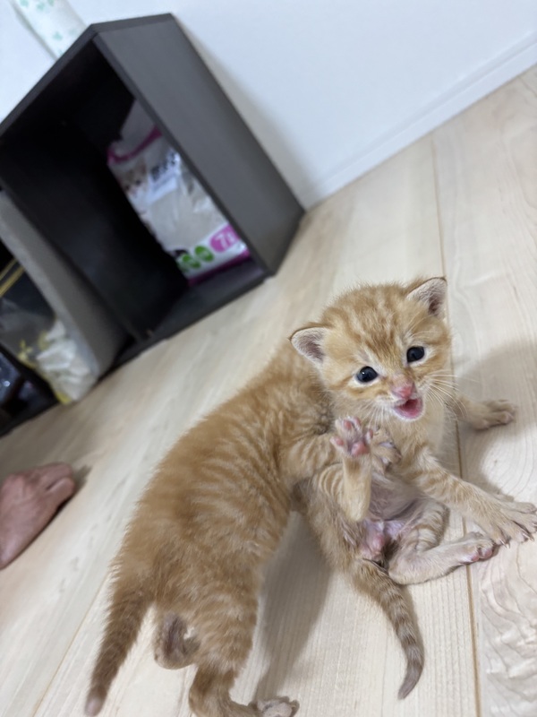 | 特徴(性格など) | 赤茶色の茶トラくん・薄白色の茶トラくん やんちゃで、甘えん坊です。 人が好きですぐによじ登ってきてくれます。 目を離した隙に部屋中を探検にいっちゃう肌の冒険家たち。 離乳食トライ中 5/21 初めての自力でのトイレ |