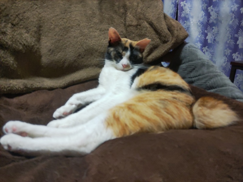 | 特徴(性格など) | 三毛猫、マキマキ尻尾、お転婆さん、甘えん坊、よくお喋りします。ご飯は自分のペースで少食ですがドライフードとチュールを食べます。 | ||