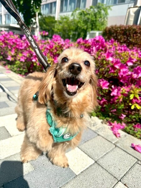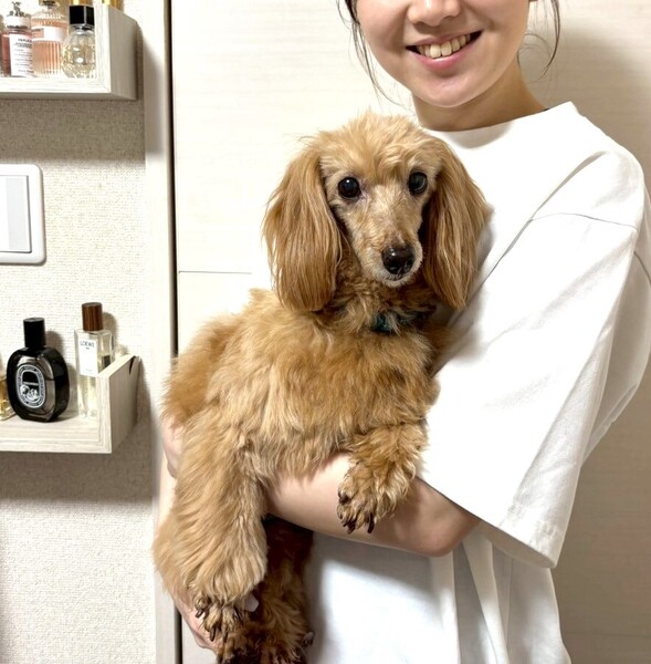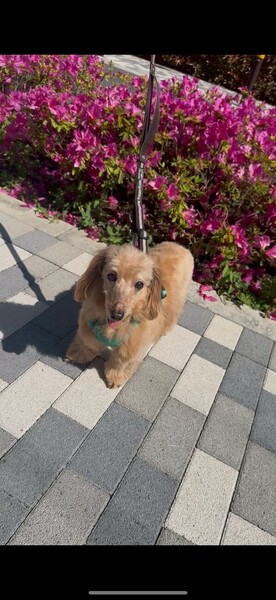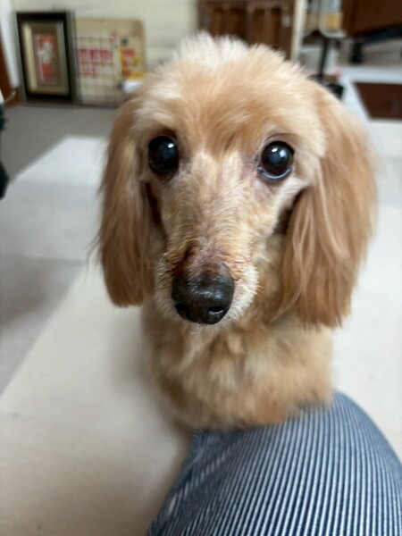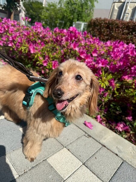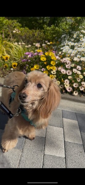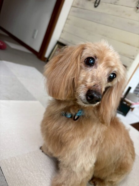 | 特徴(性格など) | とても控えめな性格で人間を観察している子かな?と思っていましたがそれも初日のみで、 どこでもついて来るストーカー気質で隙あらば撫でろと鼻ツンしてくる甘えん坊さんでした。 前足を膝の上に乗せて胸や背中を撫でて良いですよーとかお尻をくっ付けて撫でなさーいとかするのですが、 頭を撫でようと手をかざすとビクッとします。急な動きも大きな音もビクッとします。 叩かれていたのだろうかと胸が痛みます。 怖く無い様にゆっくり撫でる様にしています。 お散歩はスタスタ元気に歩いて犬同士の挨拶も出来、トイレは家でも外でも大丈夫。 先住犬とは揉める事なく上手に付き合っています。 まだまだ家でのトイレが定まらず、練習中ですがゆっくり気長にお付き合いして欲しいです。 ダックスとトイプードルの掛け合わせという事で、トリミングは必要ですが、巻きが少なめでブラッシングしやすく抜け毛は少なく柔らかくて気持ちの良い手触りの素敵な毛質です。 お顔はダックス寄りで、お目目がキュルンとしたハンサムさんです。 飼い主申告の年齢が12歳という事ですが、お散歩も元気に歩いき楽しそうにしています。 正直12歳には見えないです。 元気なシニアの方など一緒に暮らすのにはピッタリだと思います。 |