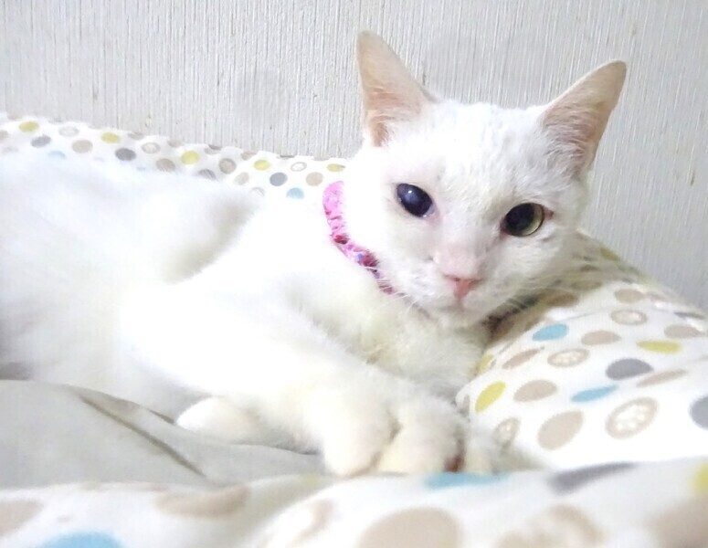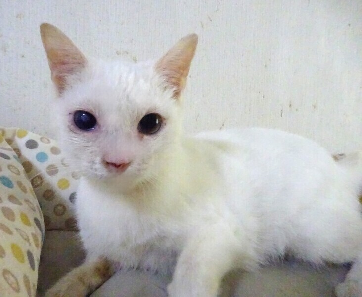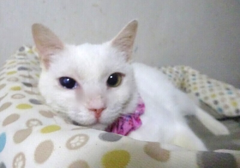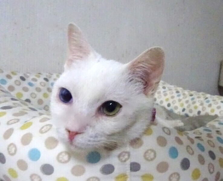| 特徴(性格など) | 仮名: レディちゃん、メス 毛色: 白猫、尻尾長い、片目不自由 性格: 人は好きでスリスリ寄ってきます。 多頭飼育でしたから、猫とはうまく付き合えるようで、いきなり大勢いても問題なく過ごせますが、特に猫好きというわけでもなく、人のほうが好きかもしれません。 大人しく見えるけど、結構、活発で好奇心旺盛。 高いところにも行きます。 食事量は少なかったようでとても小柄で最初は1食位しか食べられませんでしたが、今はきちんと残さず食べていますので、少し太りました。 片目は風邪が酷くても治療されなかったようで、角膜に穴が開き、虹彩と角膜が癒着して角膜も塞がったようで、すりガラスのような濁りも見られます。 多分、見えていないと思います。 あまり目立つ感じではなく、片目が見えているので、普通と変わりない生活が出来ます。 少し涙目になる傾向はありますが、特に目薬が必要という訳ではないようです。 甘えてきますが、抱っこが好きというわけでもなく、抱っこよりは探検に行きたい感じです。 お届けは千葉県内で、千葉市幕張から車で1時間圏内を希望します。 検便済 駆虫済 3種混合ワクチン済 避妊手術済 猫エイズ・白血病ウィルス検査は共に陰性 |